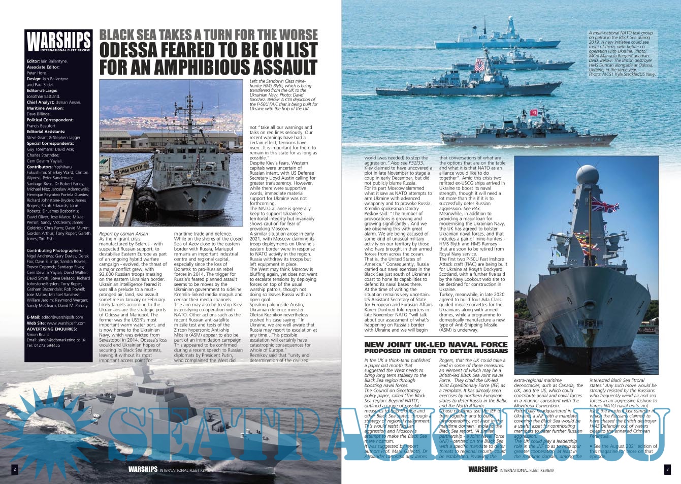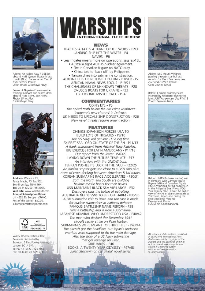 Description: Warships IFR puts the spotlight on the latest developments in the world’s navies. It covers current defence issues and has comments by leading analysts. The magazine regularly includes features on the Royal Navy and the US Navy in addition to incorporating news and features on all other navies across the globe. Warships IFR frequently carries in-depth articles on naval heritage.WARSHIPS International Fleet Review is published 12 times a year by Tandy Media Ltd who also publish Shipping Today & Yesterday (which provides news and features from the world of merchant shipping).