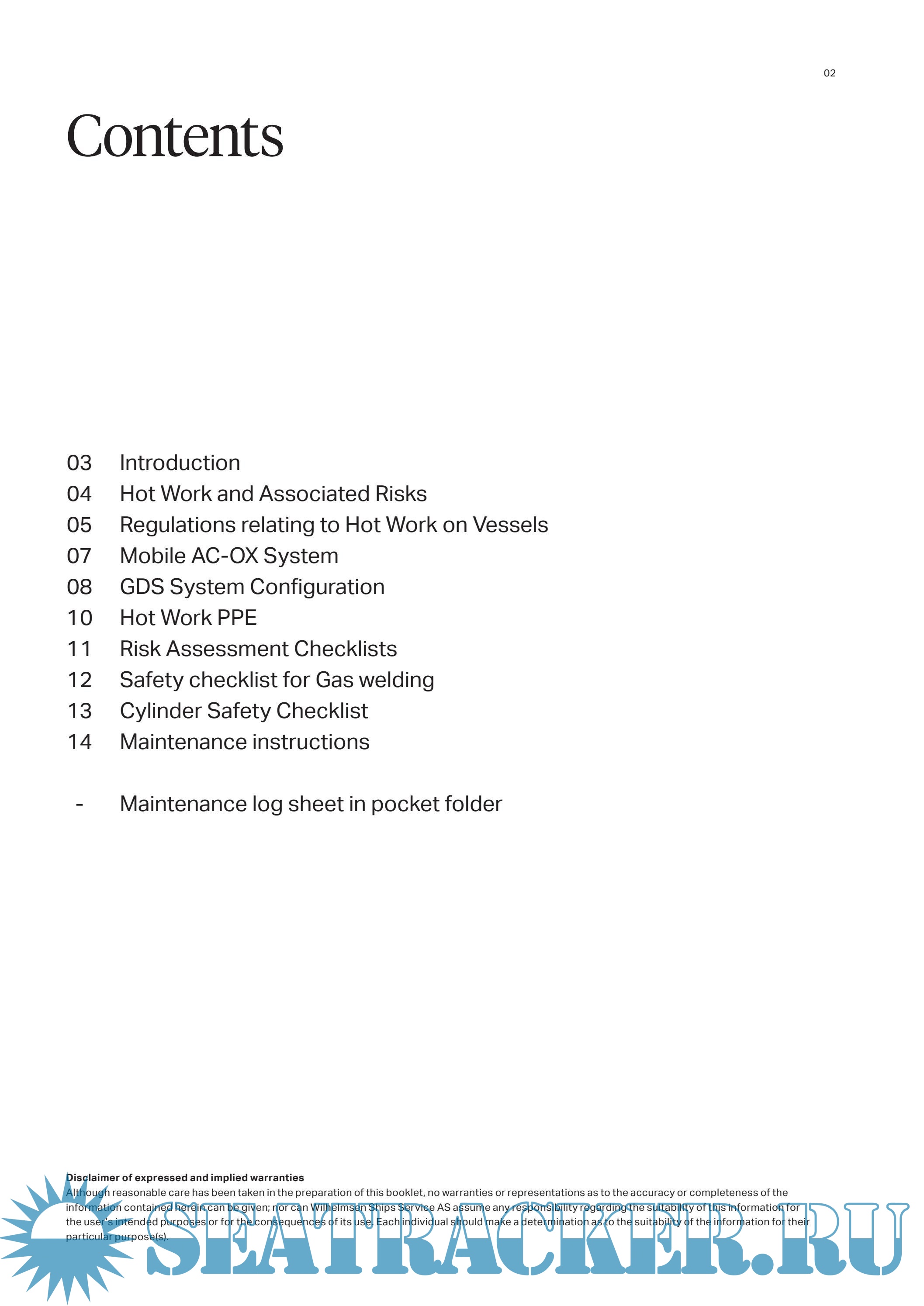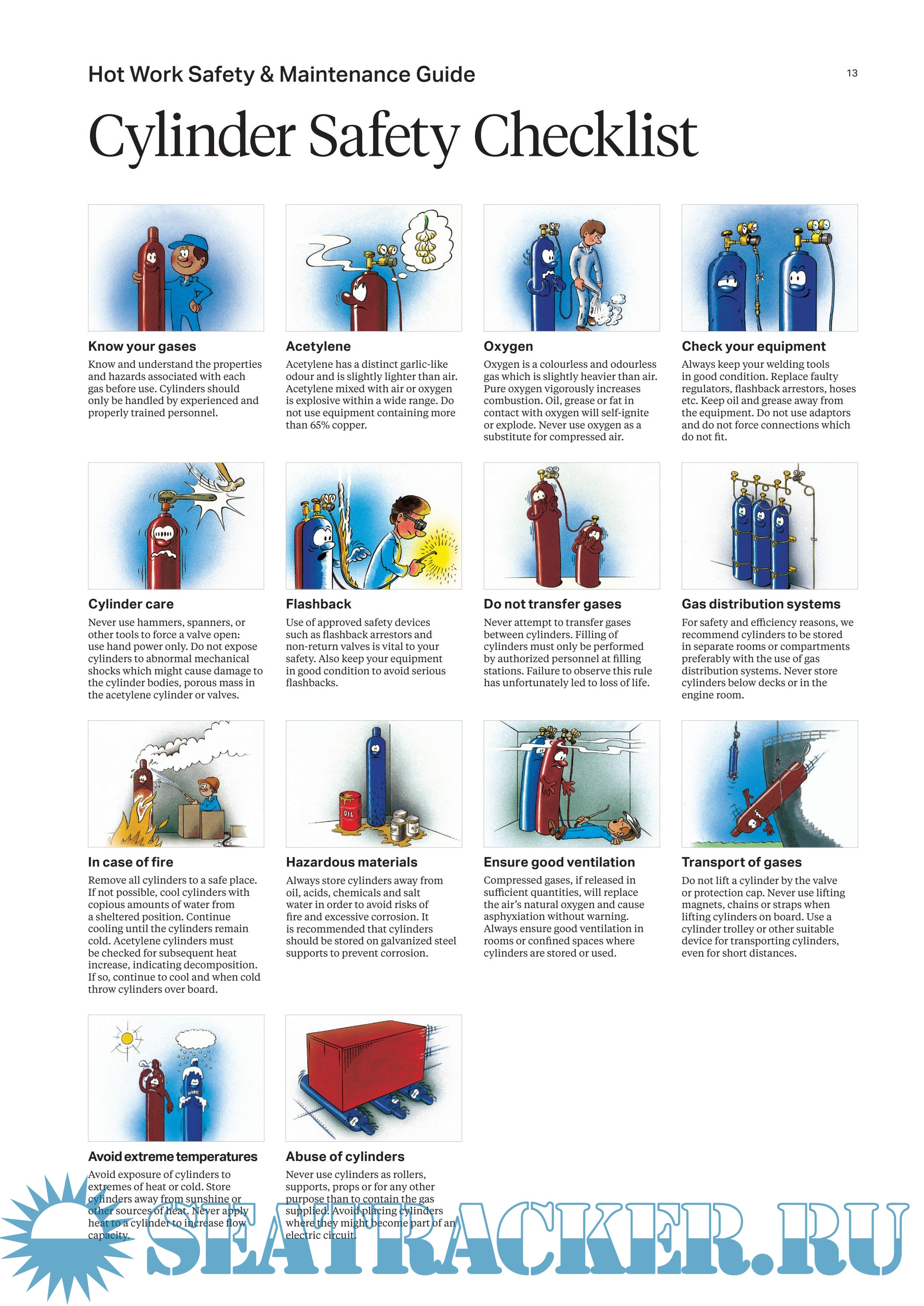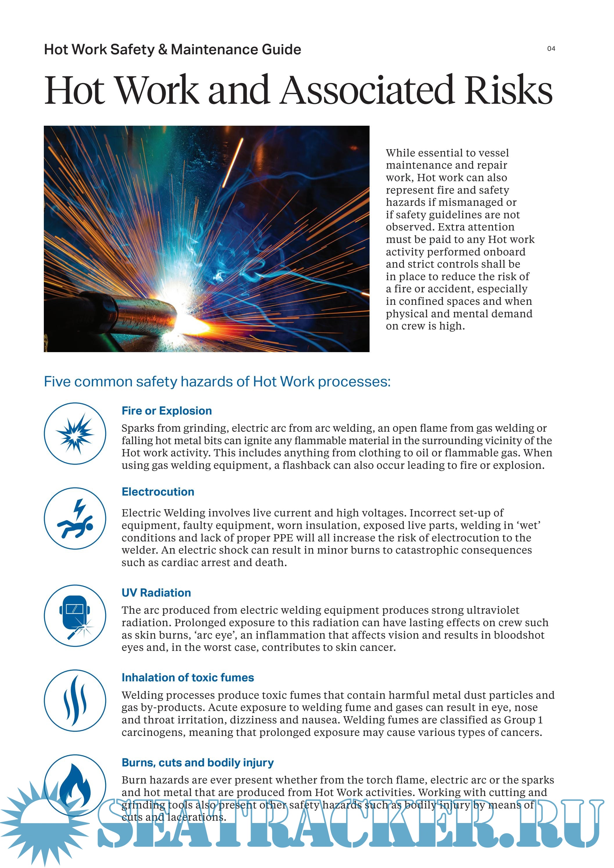 Description: The 'Hot Work Safety & Maintenance Guide' is designed as a quick reference for vessel owners and operators, highlighting everything you need to know from hot work safety risks and industry-led safety efforts to our recommended practices and considerations. We also recommend our complete Unitor range of equipment, accessories and tools, complete with maintenance instructions. We also provide maintenance log sheets designed for easy logging and tracl,ing of annual inspection of critical gas welding components.
