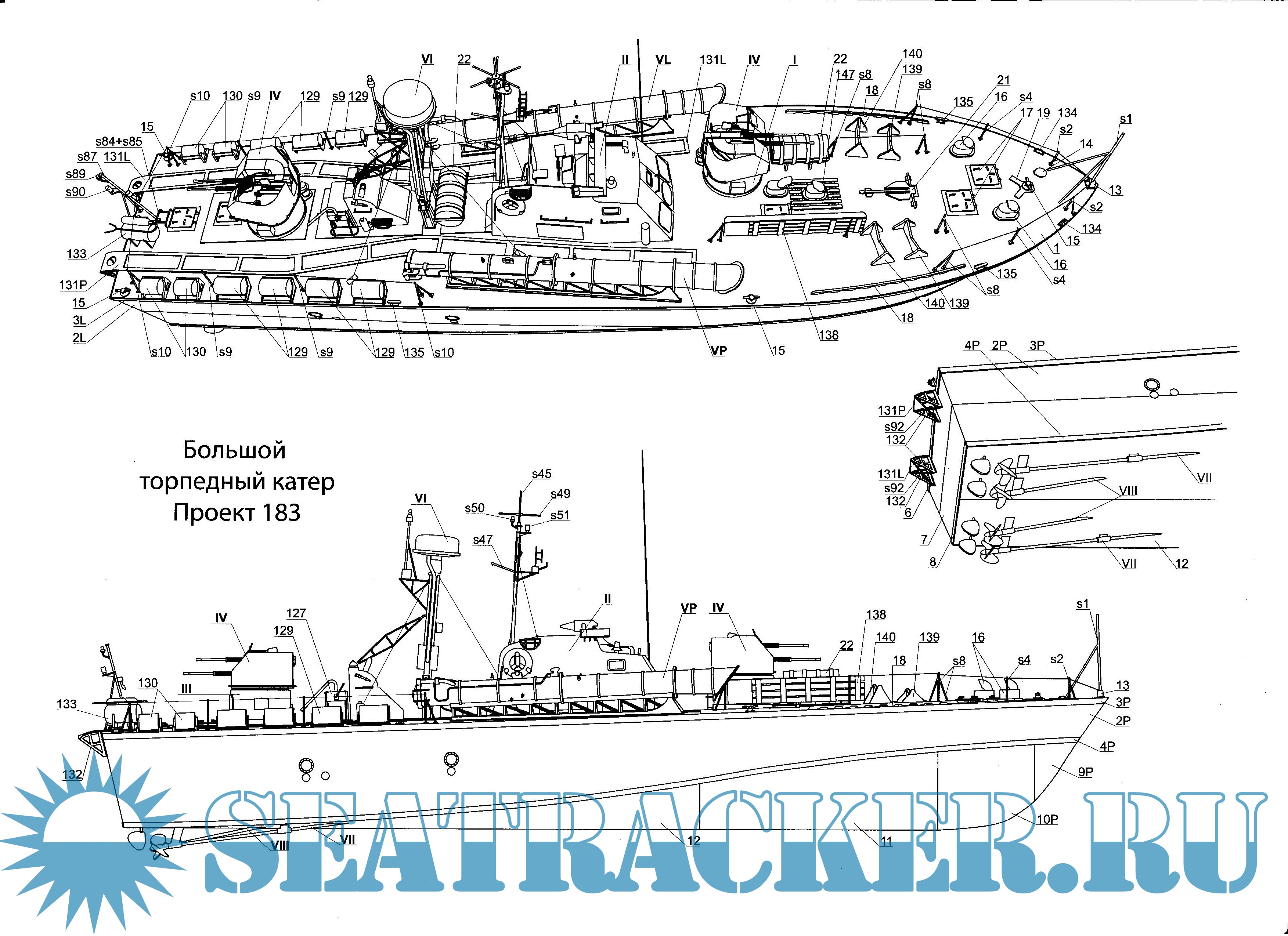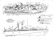 23 листа цветных выкроек и инструкций для изготовления бумажной модели большого торпедного катера или пограничного катера проекта 183 или катера-цели проекта 183Ц (шифр "Большевик") в масштабе 1:100