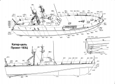 Описание: 23 листа цветных выкроек и инструкций для изготовления бумажной модели большого торпедного катера или пограничного катера проекта 183 или катера-цели проекта 183Ц (шифр "Большевик") в масштабе 1:100