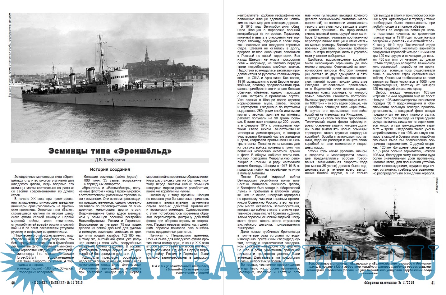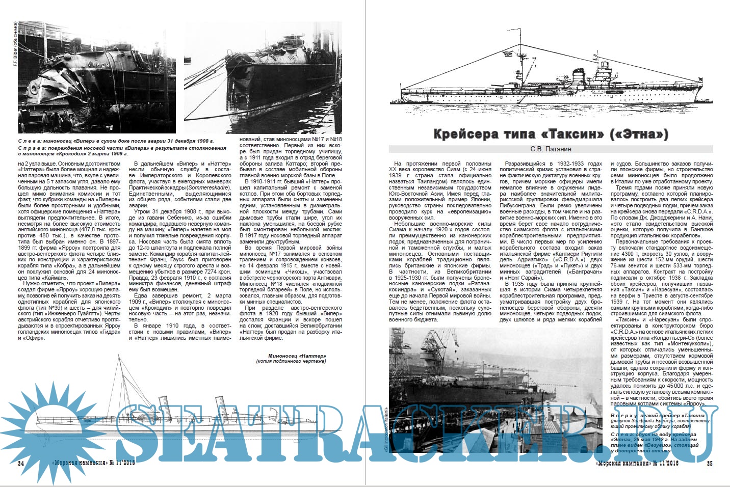 Следующая статья посвящена стории сиамских крейсеров типа «Таксин», впоследствии реквизированных и включенных в состав итальянского флота как крейсера ПВО типа «Этна», но так и не вошедших в строй. Еще один обширный материал посвящен эскадренным миноносцам типа «Эреншельд», ставших прародителями серии «стандартных эсминцев» шведского флота.