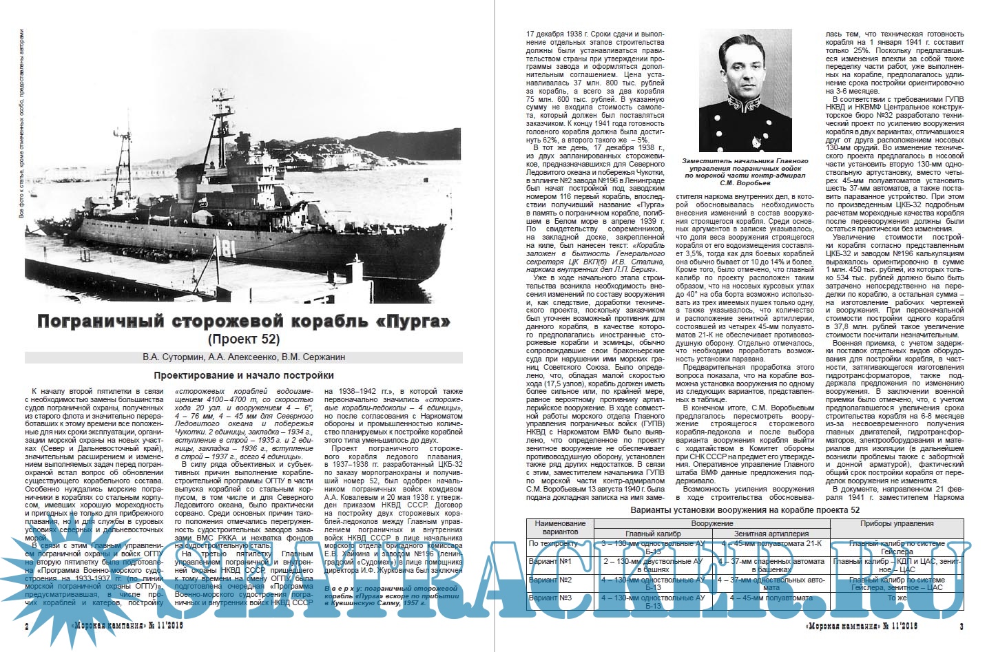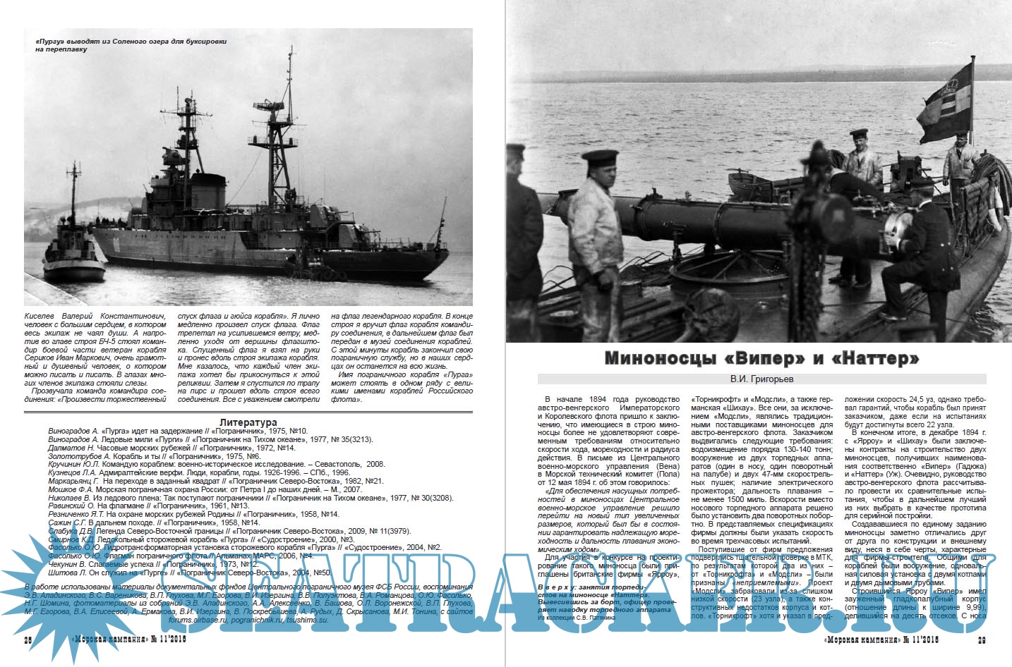 Описание: Заглавная статья номера посвящена пограничному сторожевому кораблю «Пурга» проекта 52 - первому отечественному боевому кораблю ледокольного типа. Работа написана по материалам фондов Центрального пограничного музея ФСБРФ и воспоминаниям ветеранов. Вторая статья рассказывает о миноносцах «Випер» и «Наттер», построенных в рамках конкурса на выбор прототипа для будущей серии миноносцев I класса австро-венгерского флота.