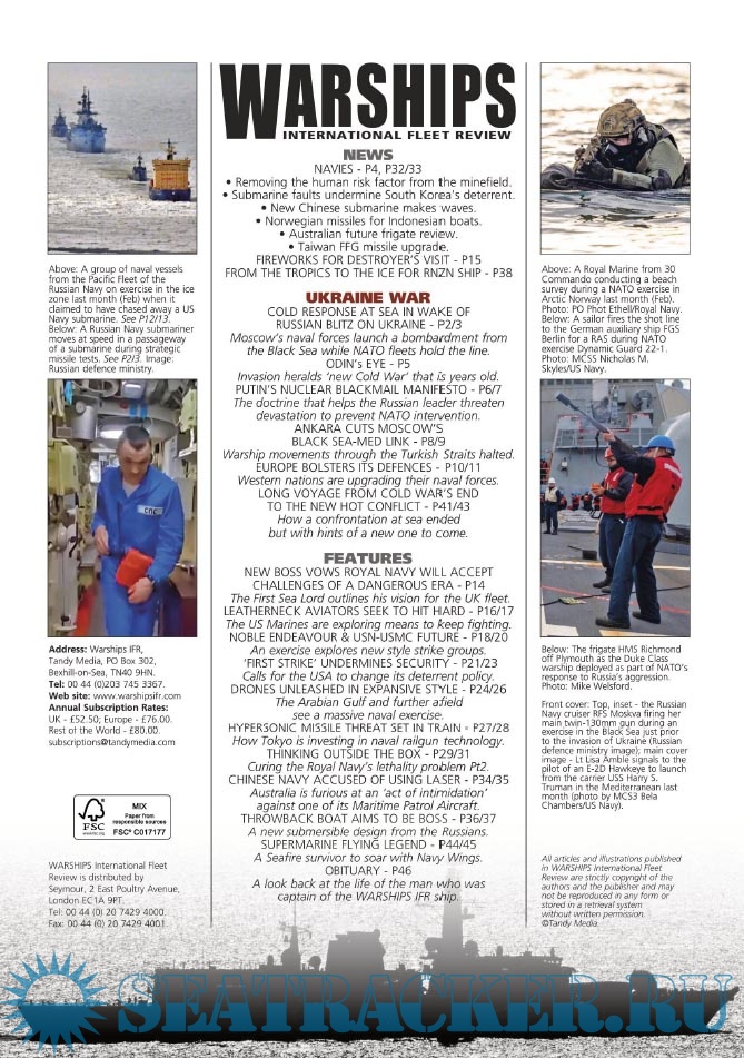 Description: Warships IFR puts the spotlight on the latest developments in the world’s navies. It covers current defence issues and has comments by leading analysts. The magazine regularly includes features on the Royal Navy and the US Navy in addition to incorporating news and features on all other navies across the globe. Warships IFR frequently carries in-depth articles on naval heritage.WARSHIPS International Fleet Review is published 12 times a year by Tandy Media Ltd who also publish Shipping Today & Yesterday (which provides news and features from the world of merchant shipping).