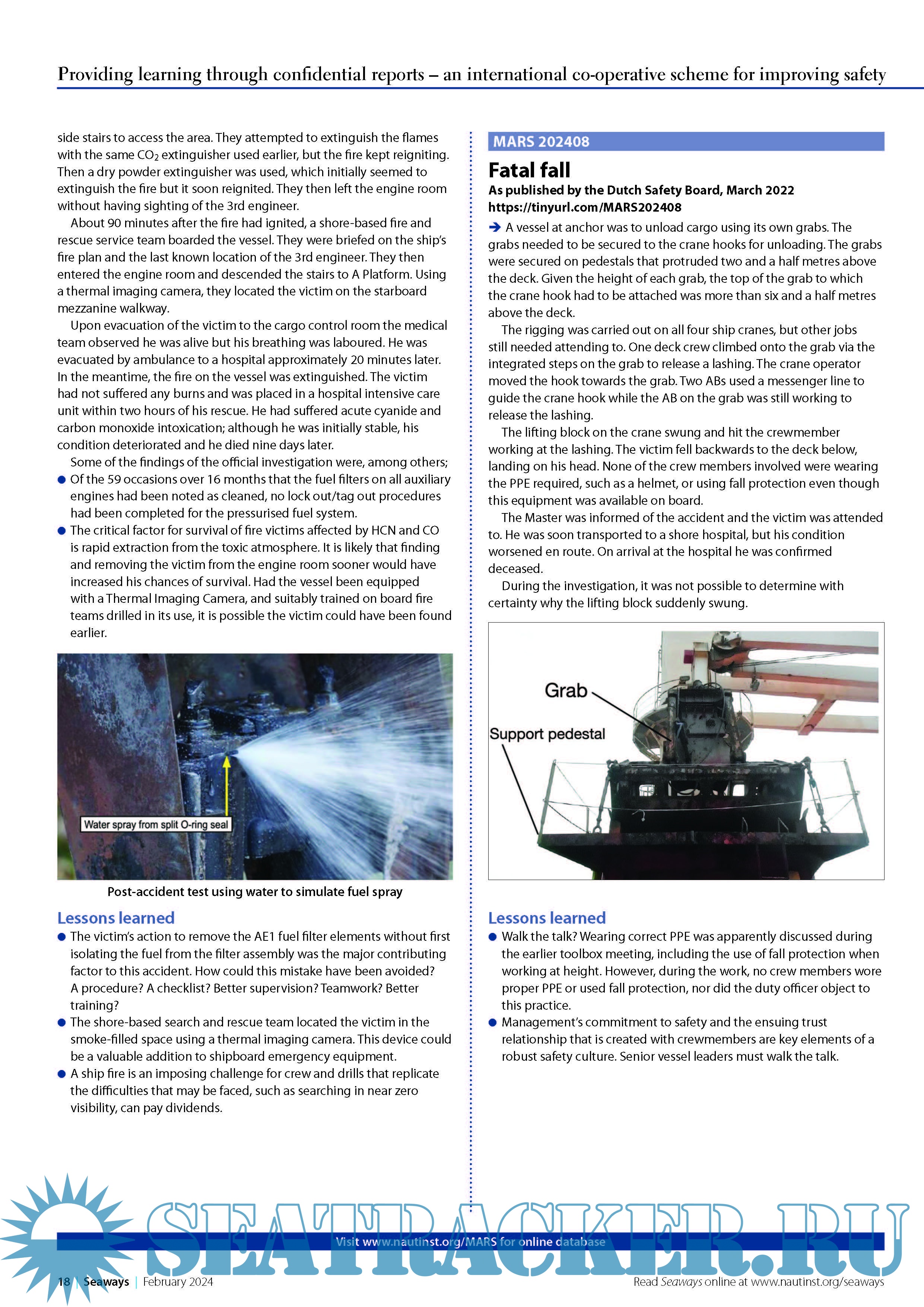 Year: 2024 Language: English Author: The Nautical Institute Genre: Periodical (magazine) Format: PDF Quality: eBook Pages count: 4 Description: MARS Report No 376 February 2024 Providing learning through confidential reports – an international co-operative scheme for improving safety.MARS is a searchable database containing reports of accidents and near misses stretching back over a quarter of a century. Funded through the generous support of the Institute's Nautical Affiliate partners, it is one of the maritime industry's leading risk reduction initiatives and is helping to make life safer for seafarers everywher.