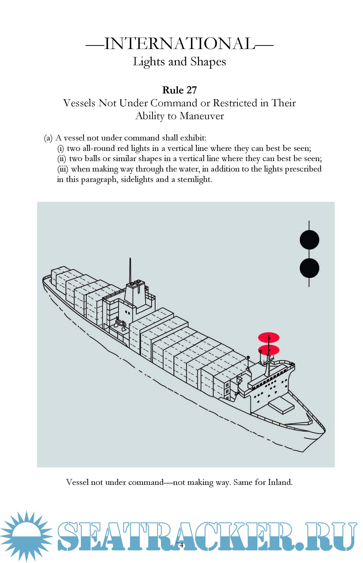 The International Rules in this book were formalized in the Convention on the International Regulations for Preventing Collisions at Sea, 1972, and became effective on July 15, 1977. The Rules (commonly called 72 COLREGS) are part of the Convention, and vessels flying the flags of states ratifying the treaty are bound to the Rules. The United States has ratified this treaty and all United States flag vessels must adhere to these Rules where applicable. These Rules are applicable on waters outside of established navigational lines of demarcation. The lines are called COLREGS Demarcation Lines and delineate those waters upon which mariners shall comply with the Inland and International Rules. COLREGS Demarcation Lines are contained in this book. This handbook is a compendium produced by the U.S. Coast Guard Office of Navigation Systems, U.S. Coast Guard Headquarters, Washington, D.C, of the International and Inland Rules of the Road and their respective annexes, the Bridge-to-Bridge Radiotelephone Regulations, and Vessel Traffic Management Regulations, as last updated in September 2020 by 85 FR 58268. Additional info: