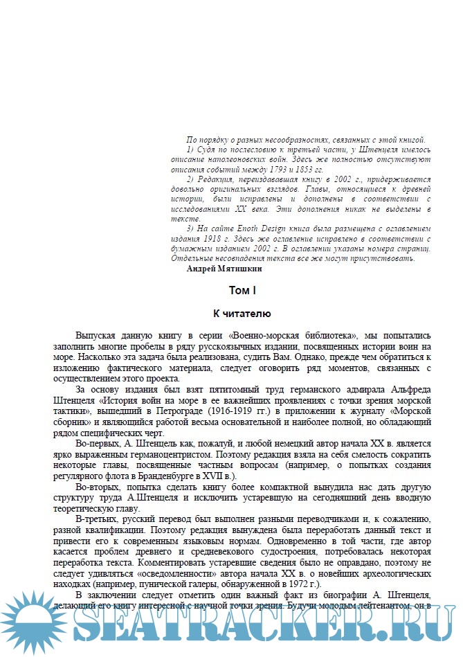 Год выпуска: 2002 Язык: русский Автор: Штенцель Альфред Жанр: История Издательство: Изографус, ЭКСМО-Пресс Формат: PDF Качество: Изначально компьютерное (eBook) Количество страниц: 717 Описание: В основу данного издания положен пятитомный труд германского адмирала Альфреда Штенцеля «История войн на море в ее важнейших проявлениях с точки зрения морской тактики», вышедший в Петрограде (1916-1919 гг.). Первый том охватывает период с начала мореплавания в древности до первой англо-голландской войны (1652-1654 гг.) Он посвящен эпохе подавляющего господства на море гребных судов и зарождению первых парусных флотов. Читатель познакомится со всеми знаменитыми сражениями, от Саламина до знаменитой атаки Тромпа Старшего у Дувра. Яркие характеристики флотоводцев, живое описание боев и основных типов боевых кораблей обогатят представления читателя об ушедших эпохах морского соперничества. Второй том посвящен истории морских войн с 1660 г. до 1900 г. Это было время огромных боевых парусных кораблей, господства линейной тактики и появления судов нового типа, приводящихся в движение паром и защищенных броней. Данный период морской истории интересен тем, что наглядно демонстрирует факт убыстрения человеческой мысли и тот перелом в истории человечества, который начался в двадцатом столетии и продолжается до сего дня. Рутина и прогресс, практика и теория, случайность и закономерность являются основными дилеммами нашей эпохи.