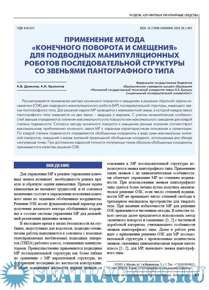 Применение метода «конечного поворота и смещения» для подводных манипуляционных роботов последовательной структуры со звеньями пантографного типа