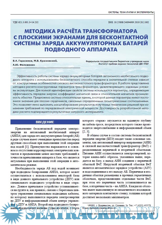 Методика расчёта трансформатора с плоскими экранами для бесконтактной системы заряда аккумуляторных батарей подводного аппарата
