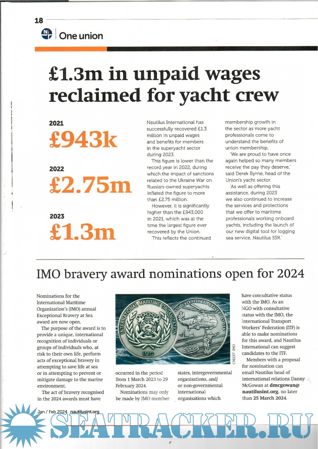 Regular readers of the Telegraph will also be aware of Nautilus's record of reclaiming unpaid wages. This has continued, with a judgment in Antigua's High Court granting more than a year's worth of backpay for crew of the yacht Alfa Nero. It's an important win on untested legal territory, as the case arose due to sanctions related to Russia's invasion of Ukraine (page 19).