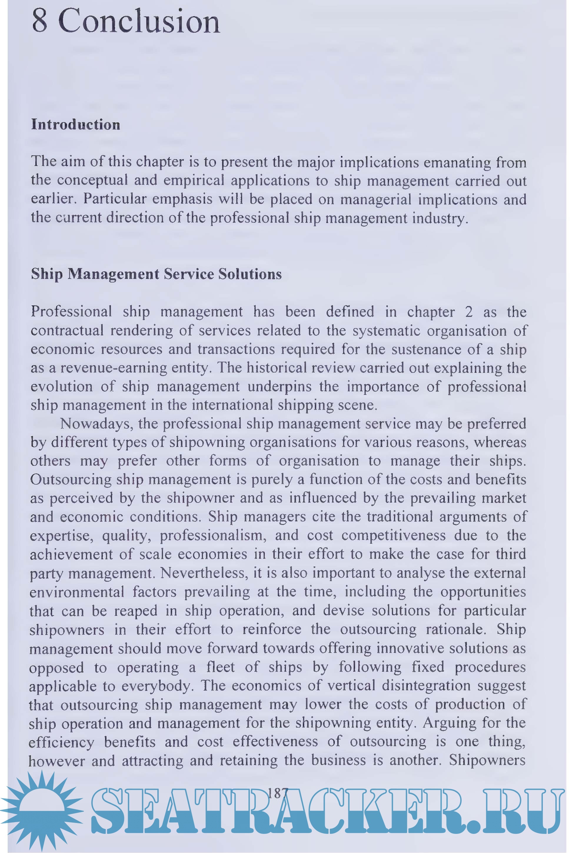 Description: Professional ship management represents a structural change in the maritime industry - there was a period when ships were managed by their owners. The strides towards growth and the importance of ship management have been recognized since the early 1970s. Large ship management companies can offer benefits to their clients that culminate in the improved efficiency of the shipping market at large. Efficiency arises from the effective use of resources so as to produce the maximum output with the least input. Large shipping management firms can do this because they can reduce average costs by virtue of their size, as well as maintaining effective organization of resources by virtue of their professionalism.