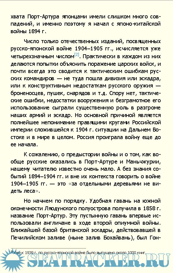 Глава 1. Генеральная репетиция 1 Глава 2. Разруха в головах 6 Глава 3. Русская армия и флот к 1904 году 15 Глава 4. Путешествие Николая II в Японию 19 Глава 5. Строительство Великого Сибирского пути 21 Глава 6. Порт-Артур становится русским портом 24 Глава 7. Участие России в интервенции в Китае 28 Глава 8. Нападение китайцев на КВЖД 34 Глава 9. Боевые действия в бассейне Амура 37 Глава 10. Разгром «боксеров» и китайских войск в Маньчжурии 39 Глава 11. Становление Желтороссии 41 Глава 12. Строительство морской базы и крепости в Порт-Артуре 45 Глава 13. Подготовка Японии к войне 50 Глава 14. История с итальянскими крейсерами 51 Глава 15. Порт-артурская побудка 52 Глава 16. Тайна гордого «Варяга» 55 Глава 17. Порт-Артур готовится к осаде 57 Глава 18. Русская армия в Маньчжурии 59 Глава 19. Блокада японским флотом Порт-Артура и гибель адмирала Макарова 61 Глава 20. Захват японцами Северной Кореи 68 Глава 21. Боевые действия на море с 1 апреля по 2 мая 1904 года 70 Глава 22. Высадка японцев на Ляодунском полуострове и бои на юге Маньчжурии в мае — августе 1904 года 71 Глава 23. Бои на дальних подступах к Порт-Артуру 75 Глава 24. Сражение в Желтом море 77 Глава 25. Тотальная крейсерская война — последний шанс России 79 Глава 26. Много шума из ничего (действия вспомогательных крейсеров) 86 Глава 27. Первый штурм Порт-Артура 88 Глава 28. Второй штурм Порт-Артура 92 Глава 29. Третий штурм Порт-Артура 95 Глава 30. Четвертый штурм Порт-Артура 96 Глава 31. Агония 1-й Тихоокеанской эскадры 98 Глава 32. Капитуляция Порт-Артура 102 Глава 33. Мукденское сражение 103 Глава 34. Стояние на Сыпингайских высотах 105 Глава 35. Как Лэк и Холланд «надули» русских и японцев 106 Глава 36. Оборона Владивостокского района 110 Глава 37. Война и русское общество 111 Глава 38. Россия и Европа (1904–1905) 113 Послесловие 116 Приложение 1. Корабли русского флота (1904–1905) 117 Приложение 2. Корабли японского флота (1904–1905) 122 Список использованной литературы 127 Иллюстрации 128