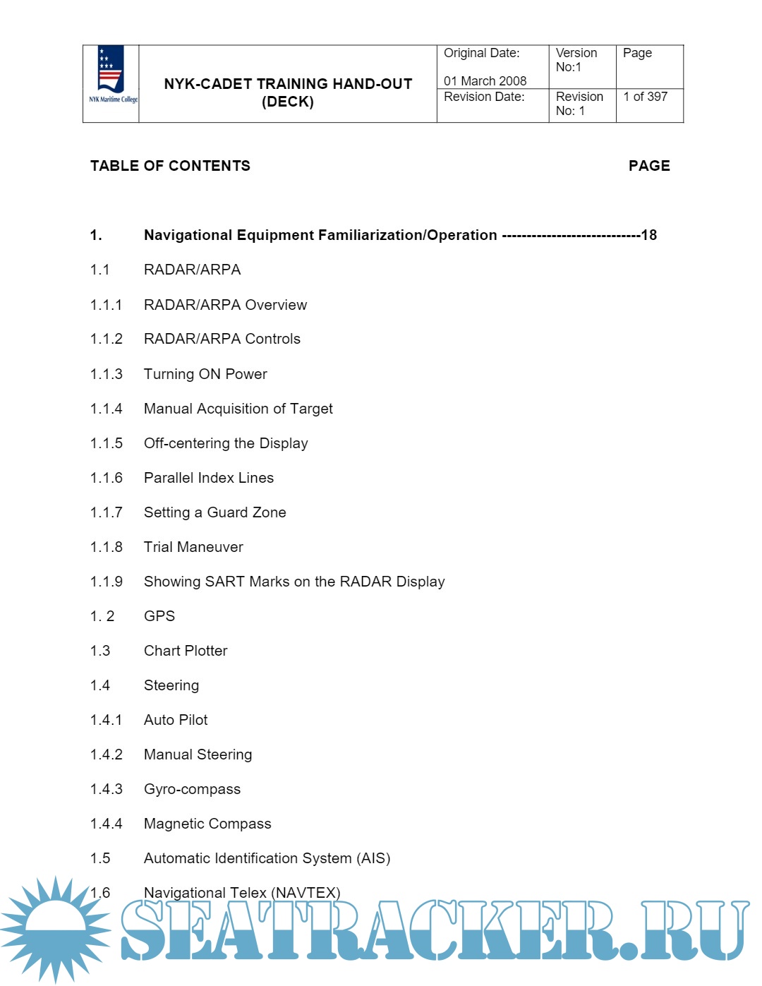 Year: 2008 Language: English Author: NYK Format: PDF Quality: Unknown Pages count: 397 Description: A guide booklet for Deck Cadets and Navigators.
