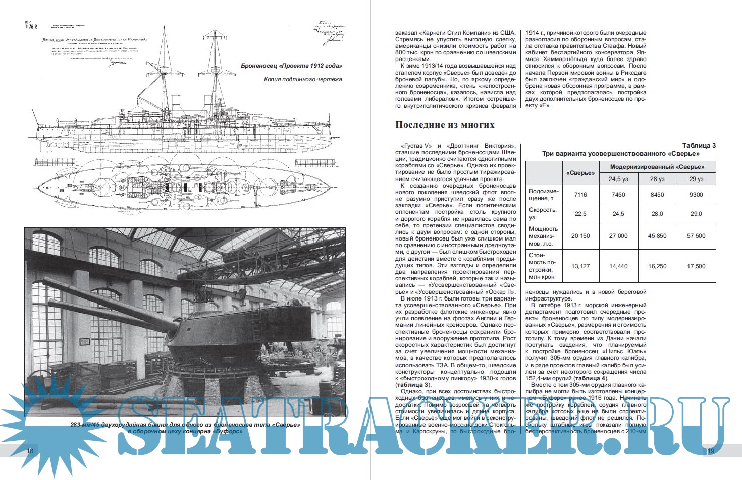Описание: «Пренебрегать Швецией ради малочисленности ее населения и наших бывших побед над нею было бы неосновательно. Достаточно видеть ее флот и армию, хотя немногочисленные, но содержащиеся в изумительном порядке и примерной боевой готовности, чтобы понять, что военные недоразумения с нею вызовут значительные усилия с нашей стороны», – писал в 1910 г. русский посланник в Стокгольме. Тогда после гибели в Цусимском сражении основных сил Балтийского флота, Швеция впервые с начала XVIII в. стала сильнейшей на Балтике морской державой. Броненосцы, главная ударная сила шведского флота (Svenska marinen), находились в его составе более девяноста лет (всего шведы построили 15 броненосцев шести различных типов).