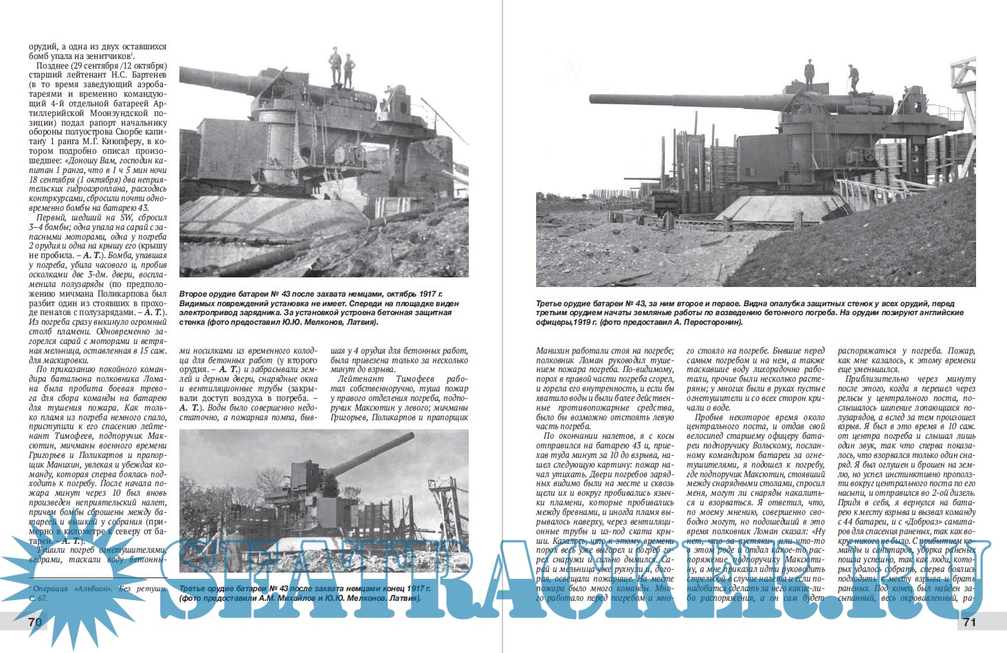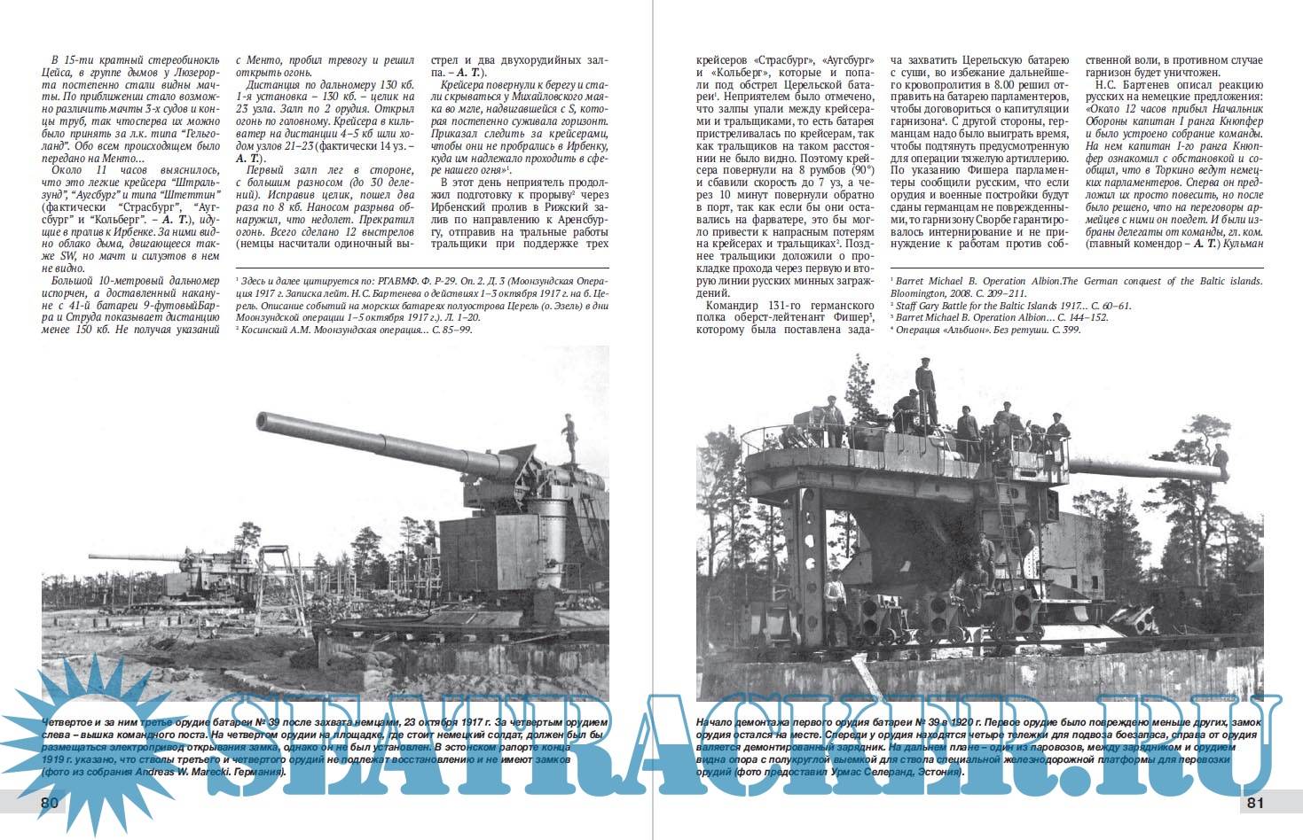 Описание: "Линейный корабль типа "Кайзер" стоял к нам левым бортом, под курсовым углом около 90 градусов… Первые залпы четыре-пять были сравнительно недурны. Один из залпов лег так: разрыв между труб - столб не большой, второй вправо под кормой делений на 30 в сторону. Впоследствии, в плену, мы узнали, что в "Кайзера" было попадание в шестидюймовую батарею. После этого он быстро пошел на удаление…" - вспоминал о боевой работе в ходе легендарного Моонзундского сражения 1917 г. тяжелой береговой батареи №43 мыса Церель ее командир Н.С. Бартенев.