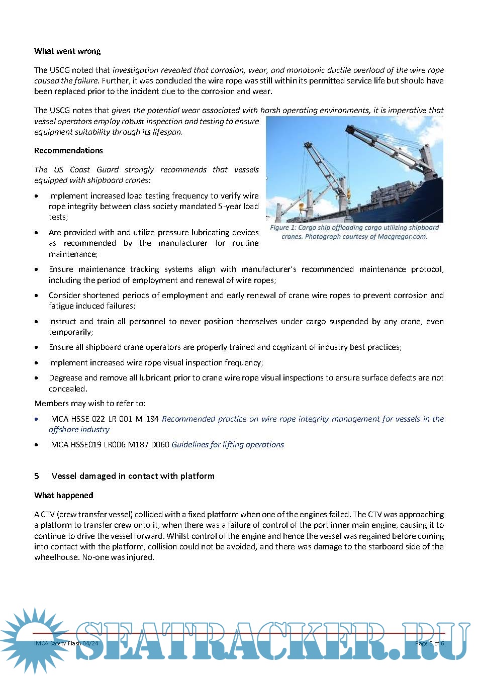 IMCA SF 04/24 • Unauthorised entry into confined space • Hot work whilst working at height in a confined space – job was stopped • BSEE: Confined space entry – tank cleaning • USCG: wire rope hazard management - dropped turbine nacelle • Vessel damaged in contact with platform IMCA SF 05/24 • Pipeline End Manifold yoke dropped from 45° position • LTI: Damage and personal injury arising from heavy weather • Crew Transfer Vessel (CTV) hit protruding scaffolding on a supply vessel • Heavy equipment fell over during manual handling • UK HSE: Crane boom collapse