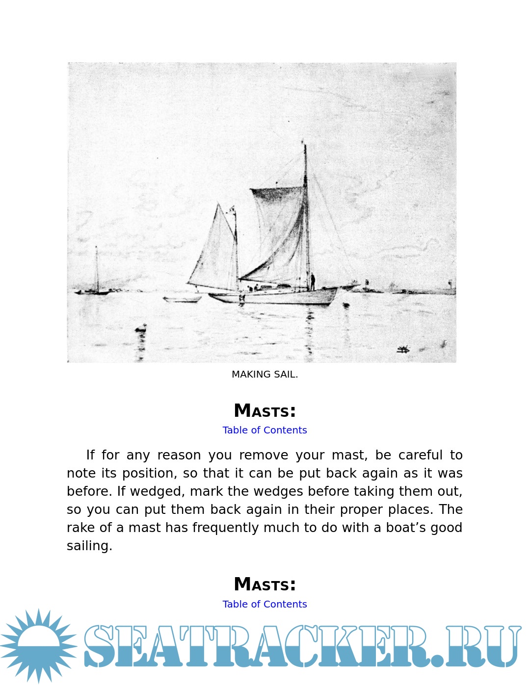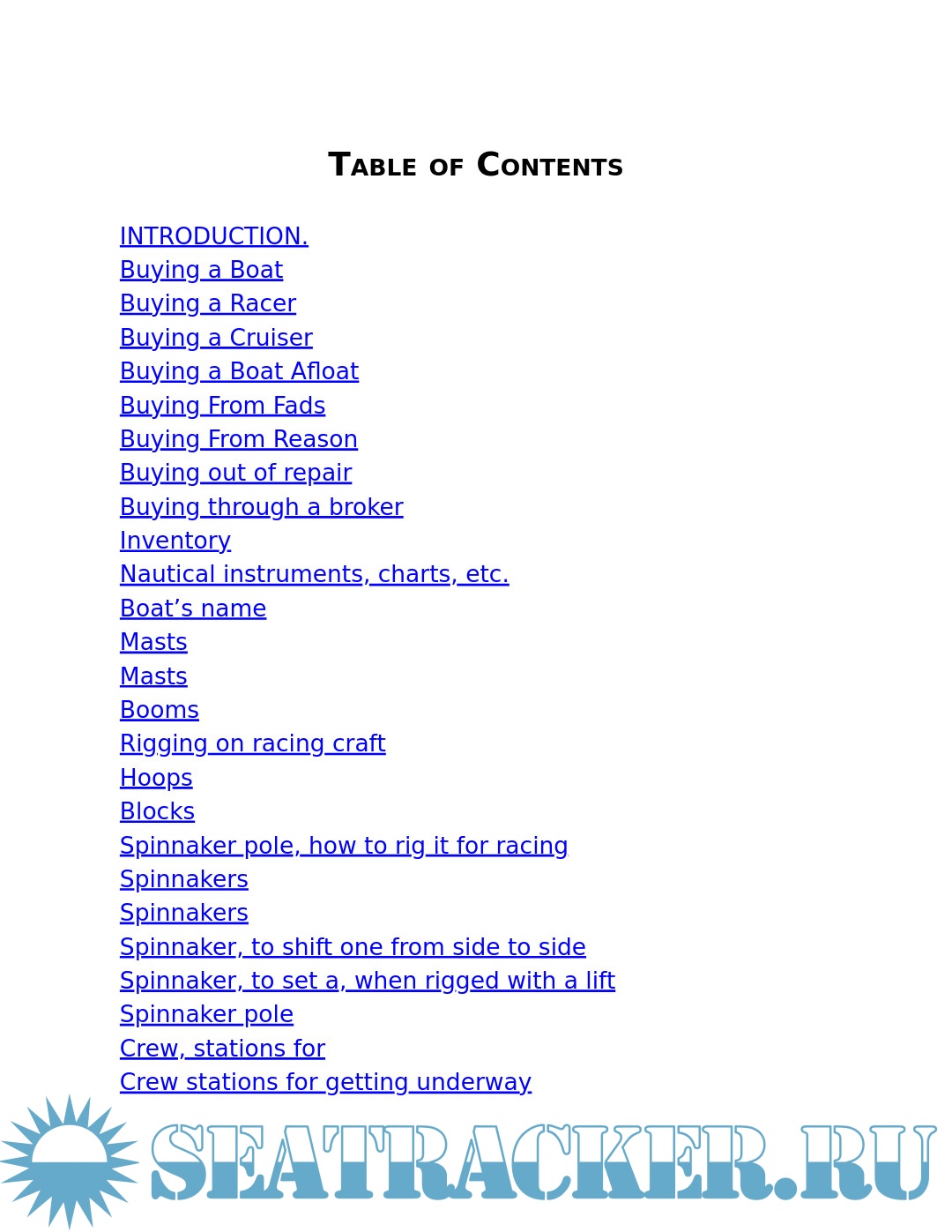 Year: 2022 Language: English Author: Day T.F. Genre: Dictionary Publisher: DigiCat ISBN: 8596547347569 Format: PDF Quality: eBook Pages count: 117 Description: In THIS book is the response to a constant appeal for information. During the last nine years I have received thousands of letters, asking for hints on all manner of subjects relating to the care, handling, buying and equipping of small yachts. The majority of these letters came from boys and young men living throughout the world, who were just entering the sport, and who were anxious to become skillful sailors and competent skippers. I can thoroughly understand their position, and sympathize with their desire for fuller and more practical knowledge than that contained in the majority of works upon yachting. What knowledge I possess of this art, or profession, I have gained by years of hard work and close observation, and having begun my studies when very young can testify to the dearth of literature of value to the green hand, who is looking for practical hints that will help him to become a skillful yacht sailor. Had I possessed a book like this, it would have saved me time, money and lots of hard work and anxiety. But, in using this book, it must be remembered that a hint is not a law or a command, it is simply a concise statement for you to take, think over, and make use of, if it appears to be logical and practical. There may be better and easier ways of doing many of these things I speak of—that is for you to find out. I am an authority only as far as my knowledge goes, and no further. The basis of my authority is my years of observation and experience; your right to confute my findings can only be based on similar premises. Unless you have tried and proved that my instructions are wrong, they are still good medicine. If a man, especially a young one, decide to go into yachting, he should also decide to learn the business of handling these craft from the keel up. It is not sufficient, as many of you think, that all that is necessary is to learn how to sail a boat about. You should know not only how to sail her, but you should know why she sails, and all about the gear and canvas used to propel her. You should learn to rig and unrig, to care for and to understand every part of her structure, both above and below decks. It is certainly a sorry spectacle to see a man sailing a yacht who cannot tie a proper knot, splice a rope, or bend a sail, and who does not know the terms used to designate parts of the structure which he essays to manage. If he is ashamed to learn, or if he is too lazy to gather such knowledge, he is out a place in a sport which is the life and joy of energetic, skillful and brave men. I hope all of my boys the world over who are coming into yachting, and to assist whom I have written these words, will never be ashamed to learn the sailor’s trade, or be too lazy to acquire all possible knowledge relating to the art of handling vessels. You will never regret having given your time to the study. It will bring to you that which is more valuable than the treasures of the earth; something that you can never be deprived of, no matter how unlucky or how unfortunate you may be—the respect paid to the skillful by the unskillful; the deference shown to the educated by the ignorant. It is as well to say here that these hints are not intended for men owning and sailing large yachts. Such vessels are too costly to be trusted in the hands of any men except those who are thoroughly competent; and if an owner has not sufficient skill to handle a large yacht it is his business to hire somebody who has. These hints are intended for the small-boat owner and skipper.