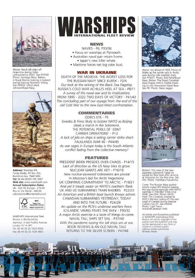 Description: Warships IFR puts the spotlight on the latest developments in the world’s navies. It covers current defence issues and has comments by leading analysts. The magazine regularly includes features on the Royal Navy and the US Navy in addition to incorporating news and features on all other navies across the globe. Warships IFR frequently carries in-depth articles on naval heritage.WARSHIPS International Fleet Review is published 12 times a year by Tandy Media Ltd who also publish Shipping Today & Yesterday (which provides news and features from the world of merchant shipping).