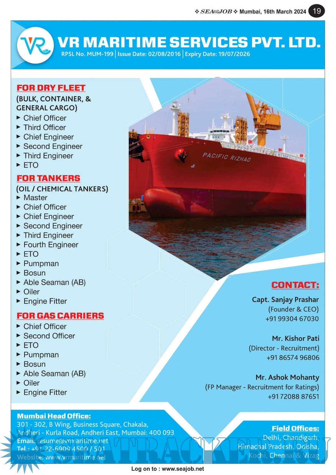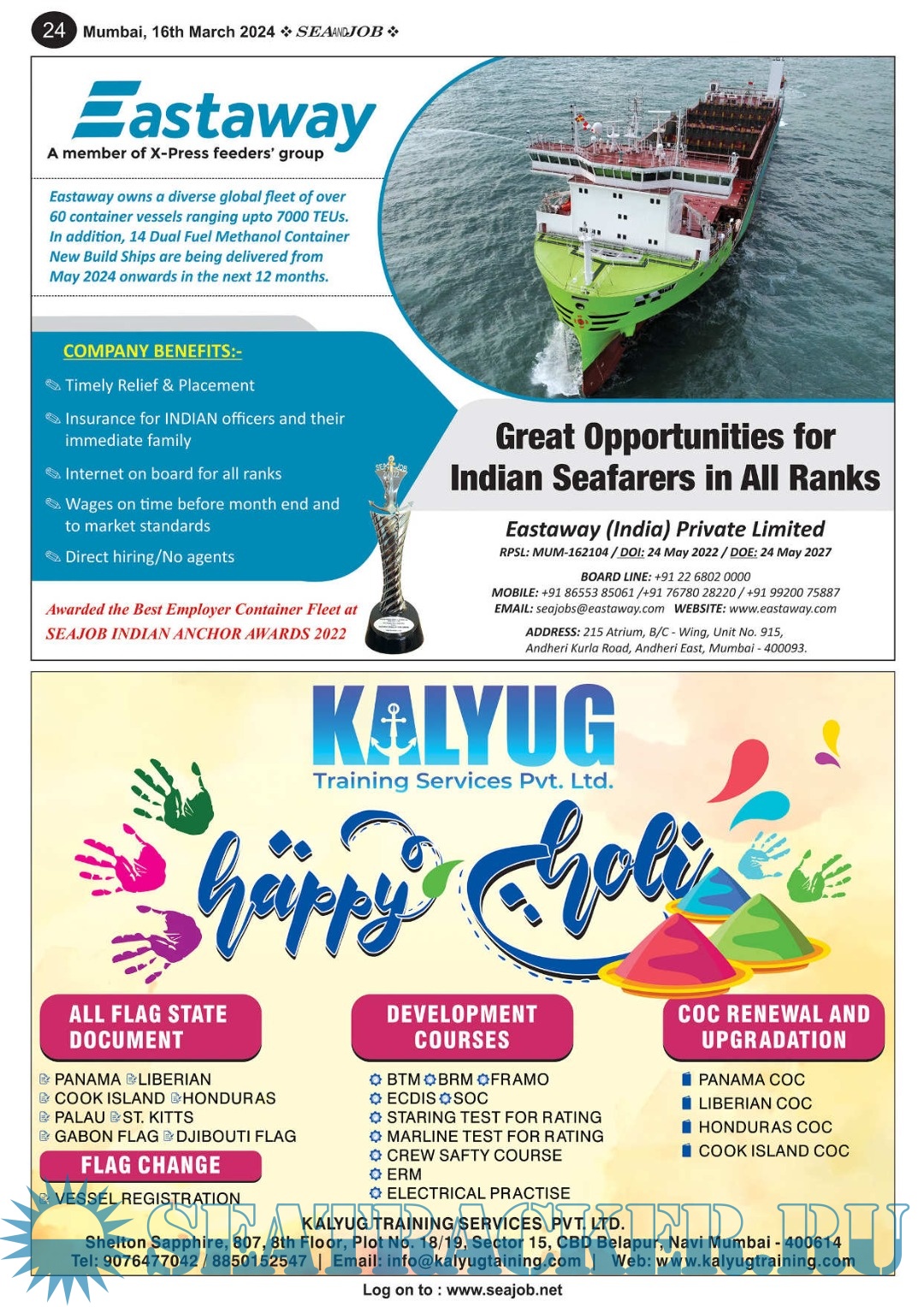 Description: The Sea and Job magazine launched in May 2007, was the second venture of Sea Line Group succeeding 'seajob.net' bringing the much renowned essence to the Group, the Sea and Job Magazine quickly gained popularity, becoming the No. 1 Shipping Magazine that came to be widely circulated all over India. Sea and Job over the years has evolved as the most trusted, ethical, objective and read maritime publication that possesses a large database of subscribers from various verticals in the industry.The magazine provides informative and interesting articles covering not just the shipping world but also the world outside it.Sea and Job is also a medium for the shipping/ manning companies to advertise marine jobs and also to promote their organization by publicizing internal activities like seminars, sports events and parties.Some notable endeavors of the magazine include the Know Your Recruiter Column, the Sailing Episodes Column and the Marine Insights section. The consistent efforts and the dedication to provide extraordinary services to the industry has resulted in the magnifying popularity and patronage of Sea and Job.