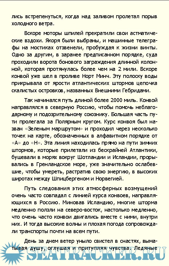 Содержание Глава 1. «Зеленый маршрут» [14] Глава 2. Главнокомандующий [26] Глава 3. «Поле судьбы» [39] Глава 4. Вопреки поражениям [50] Глава 5. Проблема [63] Глава 6. Беспокойное время [68] Глава 7. «Лично командиру» [81] Глава 8. Сочельник, 1942 год [96] Глава 9. Якорь панер [103] Глава 10. Гонка начинается [116] Глава 11. Большие кучи металлолома [135] Глава 12. Действовать осторожно [150] Глава 13. Боевая тревога [156] Глава 14. «Хиппер» атакует [172] Глава 15. «Онслоу» поврежден [188] Глава 16. Последняя радиограмма [205] Глава 17. Появляется «Лютцов» [213] Глава 18. Пли... Пли... Пли...! [227] Глава 19. Появляется «Лютцов» [249] Глава 20. «Акейтес» сражается за жизнь [261] Глава 21. Жены ждут [276] Глава 22. Томительная ночь [283] Глава 23. Шербрук, кавалер Креста Виктории [303] Глава 24. Бескровная победа [316] Глава 25. Жатва Гитлера [331] Приложения [335] Примечания Список иллюстраций