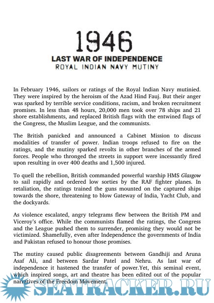 Description: In 1946, 20,000 non-commissioned sailors of the Royal Indian Navy mutinied. They were inspired by the heroism of the Azad Hind Fauj. But their anger was sparked by terrible service conditions, racism, and broken recruitment promises. In less than 48 hours, 20,000 men took over 78 ships and 21 shore establishments and replaced British flags with the entwined flags of the Congress, the Muslim League, and the communists.