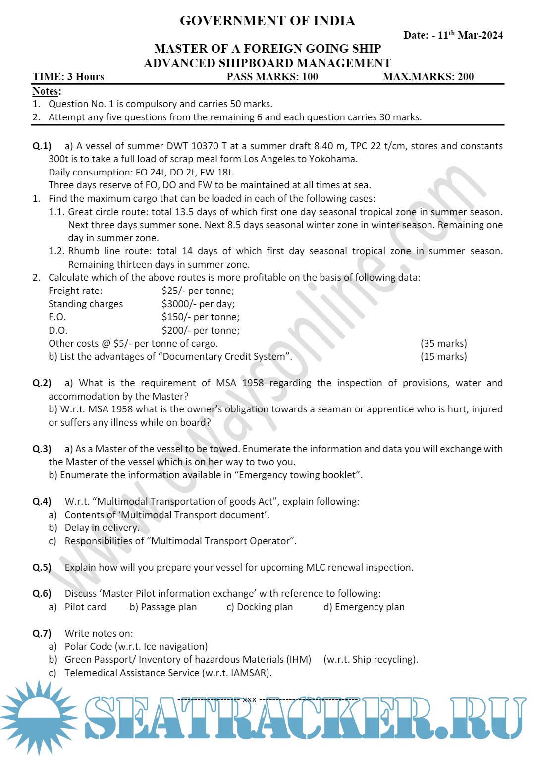 Question Paper Set for (ASM) Advanced Shipboard Management (March 2024) for Master's Examinations, Mercantile Marine Department (MMD), India