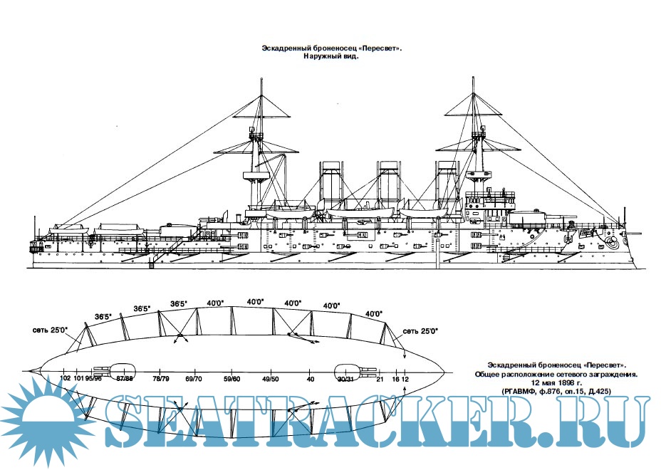 Эскадренные броненосцы типа "Пересвет" создавались для дальней океанской службы под влиянием идей британских "облегчённых" Ринауна, "Центуриона" и "Барфлера" с пониженным до 10" главным калибром.