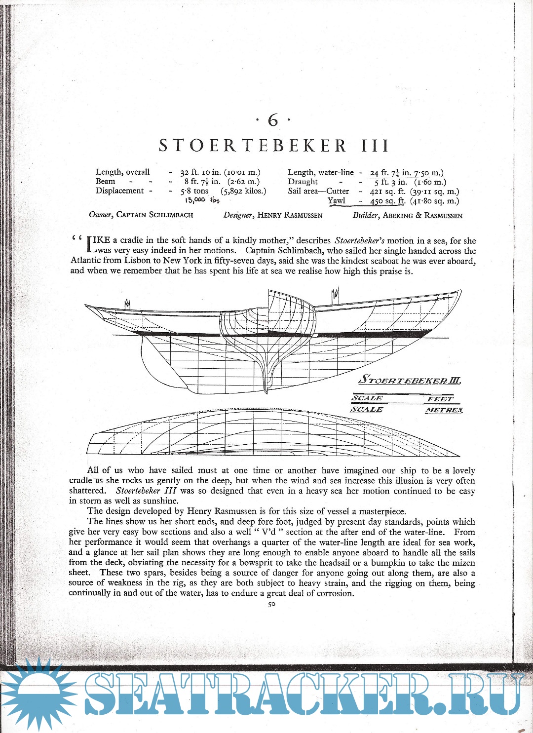 Description: Störtebeker 3 was launched by well known shipyard Abeking & Rasmussen in Lemwerder near Bremen / Germany. Two weeks later Captain Ludwig Schlimbach, a retired Captain of Hamburg-American Line (60), left Lissabon on board of Störtebeker 3 heading New York single-handed. After 57 days (3.272 Miles) on the Atlantic Ocean he arrived in New York, where he met his friends of the NYYC / CCA. With this trip the boat was highlighted in the international yachting scene. Some naval architects have praised the design at that time, e.g. Uffa Fox in his book “Thoughts on Yachts and Yachting”.