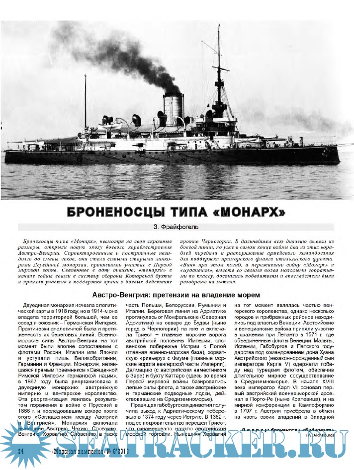 Центральный материал номера - статья историка хорватского происхождения Звонимира Фрайфогеля (Zvonimir Freivogel, Германия) об австро-венгерских броненосцах типа «Монарх». Перевод выполнил Леонид Анатольевич Олюнин (г. Котельнич Кировской обл.). Использована графика Станислава Шупика (Stanislav Supik) и Даниеля Фрка (Danijel Frka), предоставленная автором. Редакция выражает благодарность Н.В. Митюкову за помощь в подготовке материала к публикации.