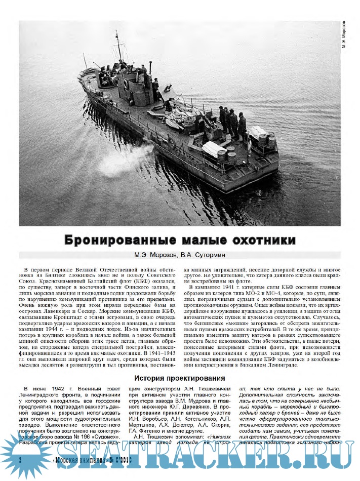 Работа кандидатов исторических наук Мирослава Эдуардовича Морозова (Москва) и Владимира Анатольевича Сутормина (г. Анапа, Краснодарский край) посвящена истории создания и боевому пути катеров типа БМО - бронированных малых охотников, строившихся в блокадном Ленинграде и принимавших активное участие в боевых действиях в Финском заливе в годы Великой Отечественной войны.