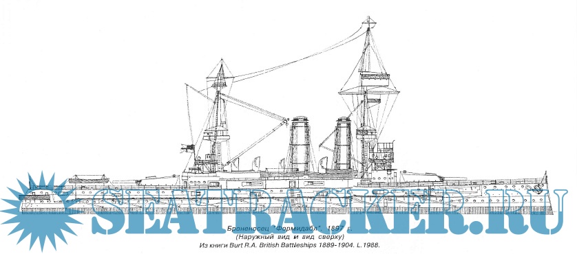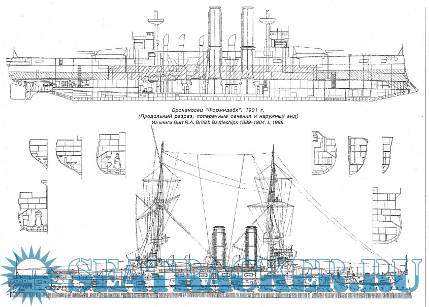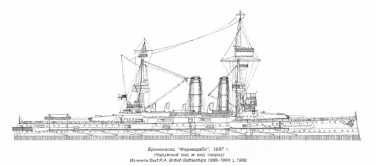 Описание: В первую неделю октября 1895 года младший конструктор Д. Дан написал письмо Контролеру флота адмиралу Д. Фишеру, в котором говорилось: “Я представляю на Ваше рассмотрение три варианта проекта нового броненосца. По каждому из них он вооружен 4 12-дм и не менее восьми 6-дм орудиями”. В варианте “А”, представленном на рассмотрение, 6-дм орудия находились в каземате за 6-дм броней, на главной палубе, между двумя двухэтажными казематами, 4 12-фунтовых орудия располагались палубой выше. Борта кораблей за исключением района казематов над главной палубой выполнялись из обычной тонкой стали. Вариант “В” отличался от варианта “А” тем, что борта кораблей от верхней до главной палубы, между казематами были защищены 4-дм гарвеевской броней, и за этими плитами стояло не по одному 6-дм орудию, а по два. Вариант “С” также был защищен 4-дм броней, но вместо 6-дм орудий планировалось установить 4-дм.