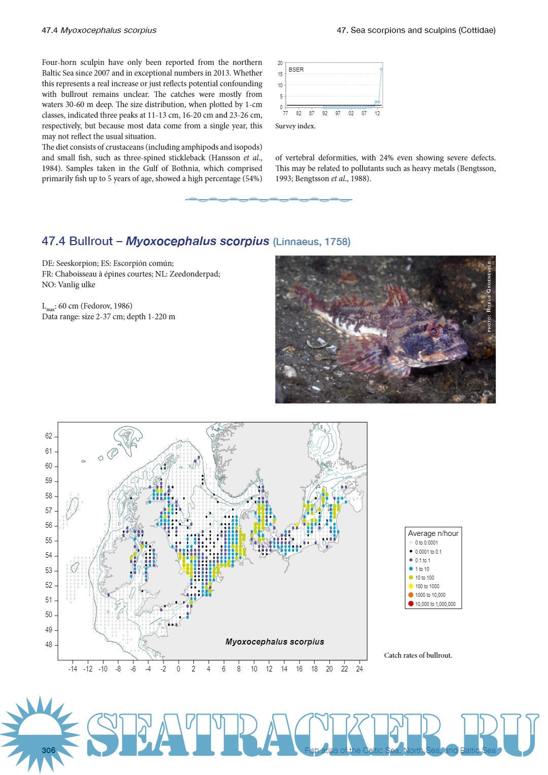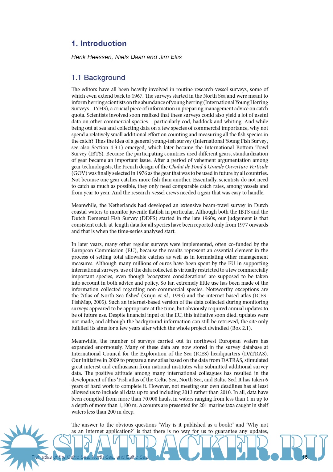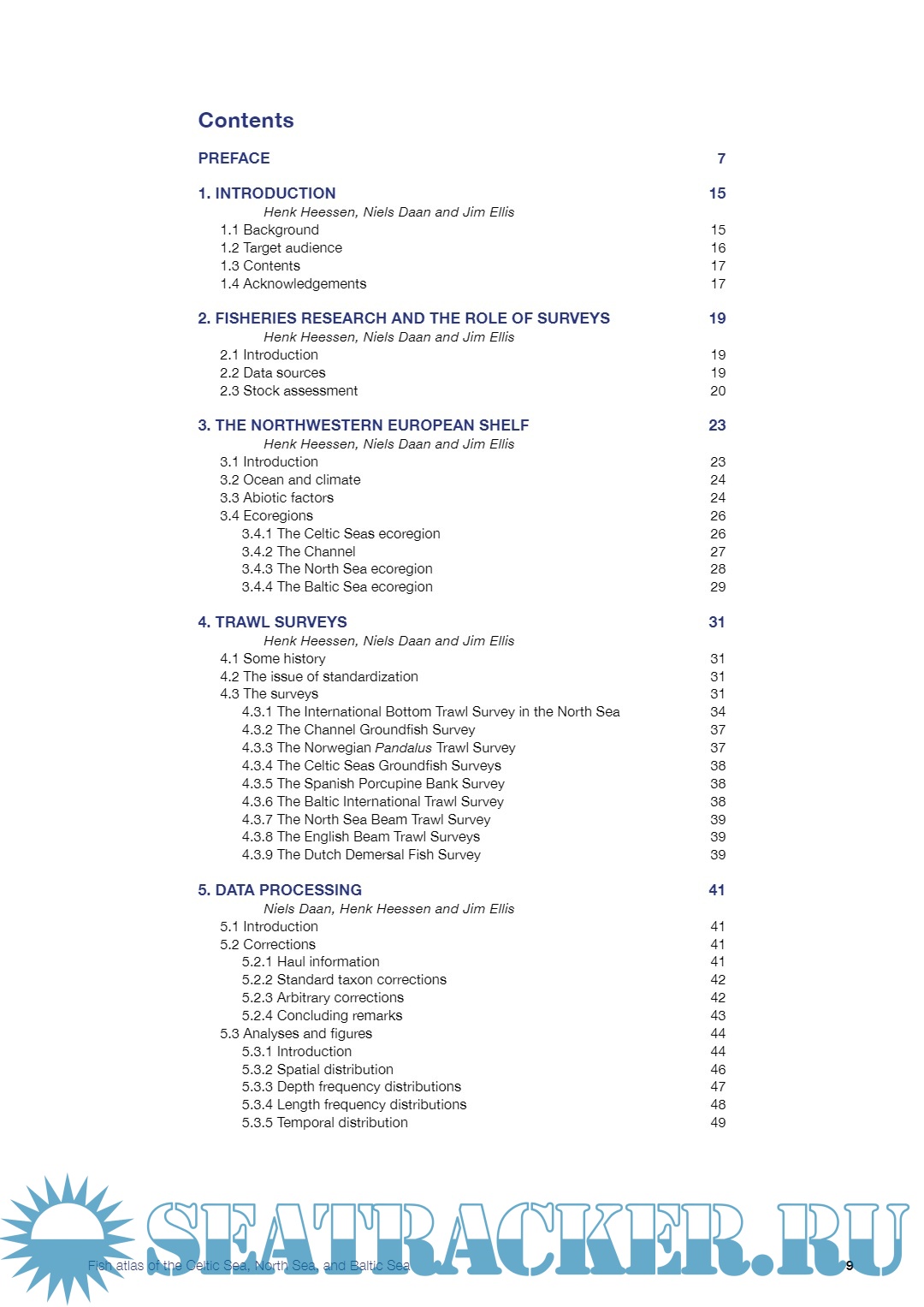 Description: The atlas presents a unique set of abundance data to describe the spatial, depth, size, and temporal distribution of demersal and pelagic fish species over an extensive marine area, together with accounts of their biology. A large number of pictures, graphs and distribution maps illustrate the text. By largely avoiding - or at least explaining - scientific terms and providing extensive references, the book should be useful for both laymen and scientists.The quantitative information on some 200 fish taxa is derived from 72,000 stations fished by research vessels during the period 1977-2013. The area covers the northwest European shelf from west of Ireland to the central Baltic Sea and from Brittany to the Shetlands. Although the surveys extend beyond the shelf edge, only taxa reported at least once in waters less than 200 m are included. Typical deep-water species and typical fresh-water species are excluded.We hope this publication will contribute to gaining a better understanding of the ocean ecosystems.