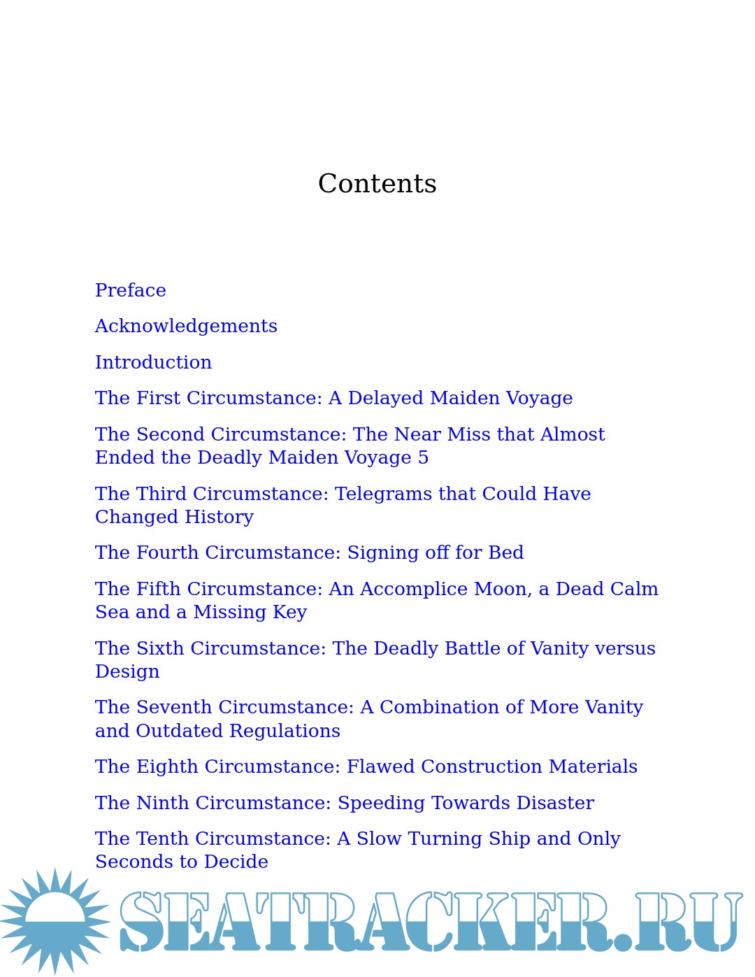 Each chapter details how seemingly disconnected pieces served to create a tragedy that remains as significant today as it was over a century ago. They include flawed design decisions, outdated regulations, substandard materials, weather conditions, lookouts left blinded and warnings never acted upon. Perhaps the most fascinating piece is a look at how events involving sister ship Olympic would result in Titanic being placed directly on course to meet the iceberg which would sink her.