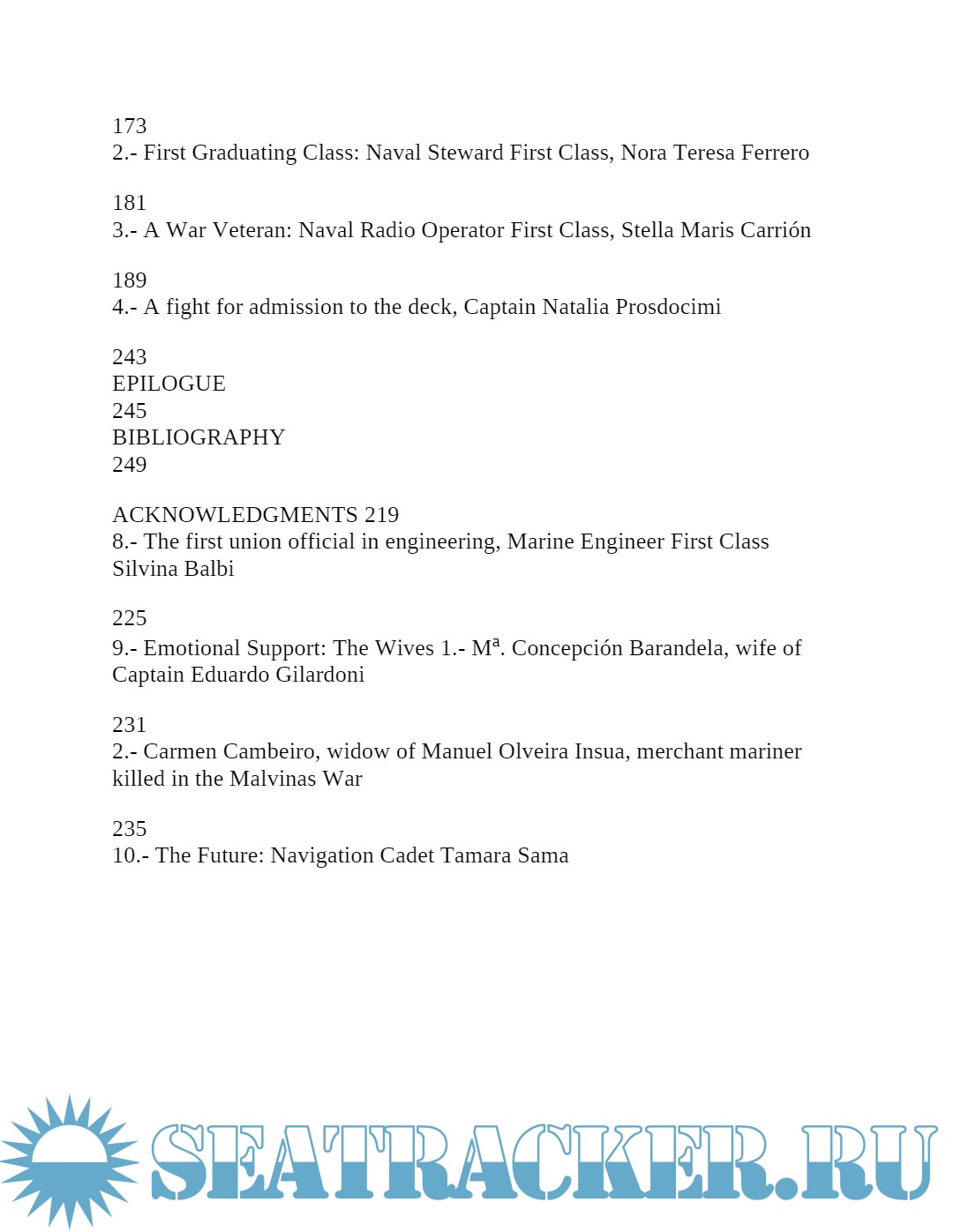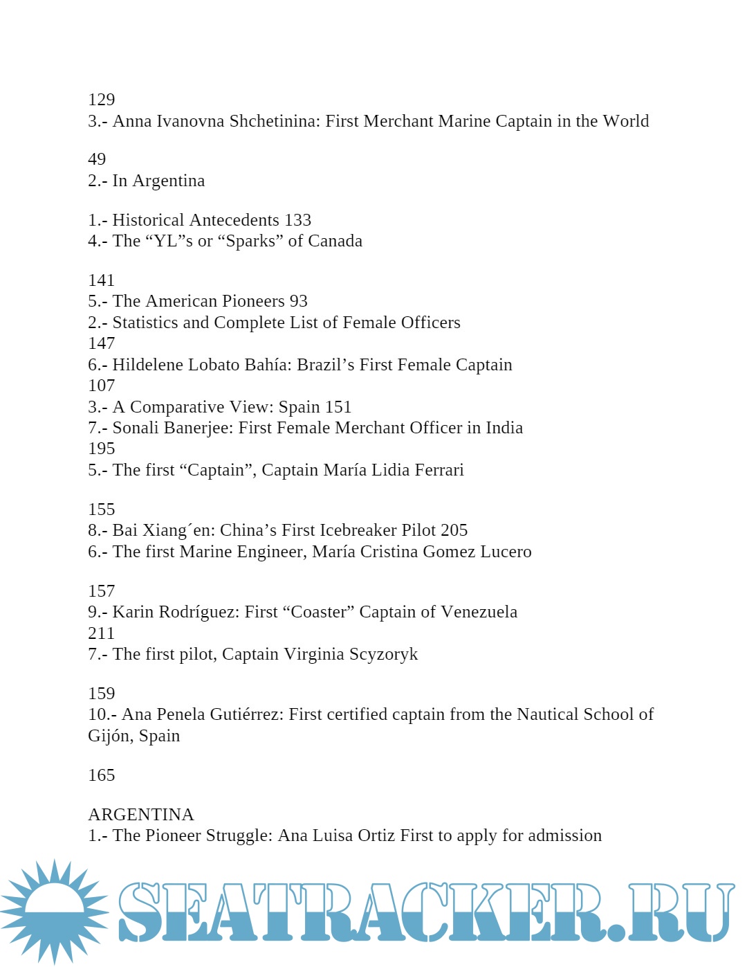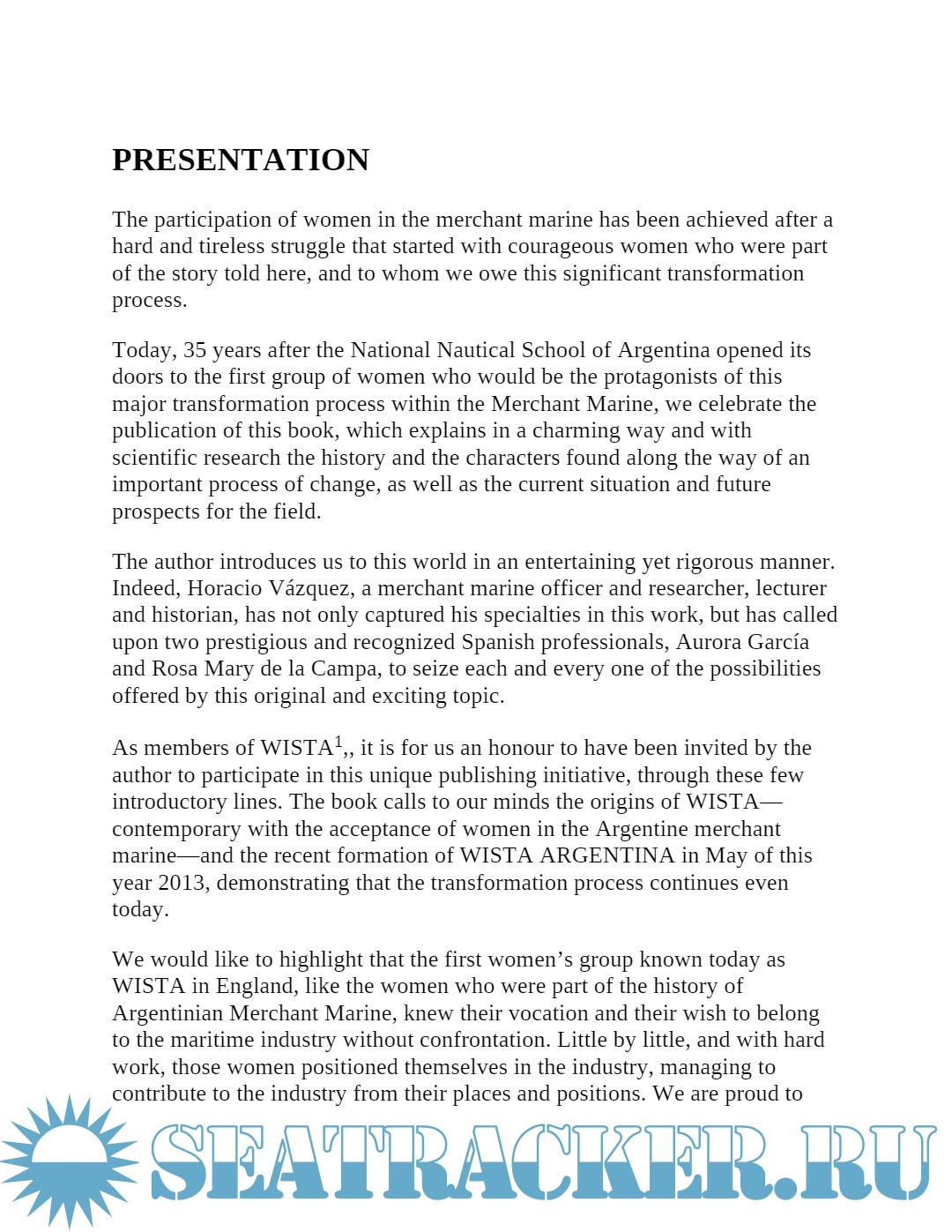 Year: 2013 Language: English Author: Horacio Guillermo Vazquez Rivarola Publisher: Nautica Ediciones Edition: Kindle ISBN: 978-987-29651-0-5 Format: PDF Quality: eBook Pages count: 247 Description: This academic study adds to the unpublished documents of the incorporation of women to the Argentine Merchant Marine , the personal experiences of the pioneers of both protagonists from Argentina, as well as many other countries. Born as part of a doctoral thesis, this book delves into the beginnings of the first female sea service on merchant ships, personally identifying most of the world's pioneers. Only work of its kind, for its originality and seriousness, has a foreword by the highest global maritime authority, the Secretary General of the International Maritime Organization, headquartered in London, was officially launched on November 6, 2013. Versions of Women in the Merchant Marine of Spain and Peru are under development right now. Beside the prolific and experienced author, Horacio Guillermo Rivarola Vázquez (Argentine National Nautical School and University of Vigo), collaborated in this work the doctors Aurora García González (University of Vigo) and Mary Rosa Portela de la Campa (Universidade da Coruña) . Additional info: About the Author: Mr. Vázquez is a radioelectronics officer in the Argentine merchant marine and professor at the National Nautical School (Naval University Institute of Argentina), where he has helped to educate many of the merchant marine officers, male and female, who now serve alongside him. He holds an M.A. in Investigation on Communications from the University of Vigo (Spain), and is presently completing his Ph.D. dissertation there on the history and organizational identity of the merchant marine. He is the author of 21 books published in Argentina and Spain.