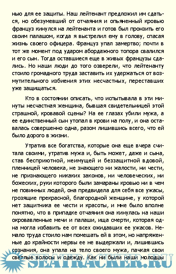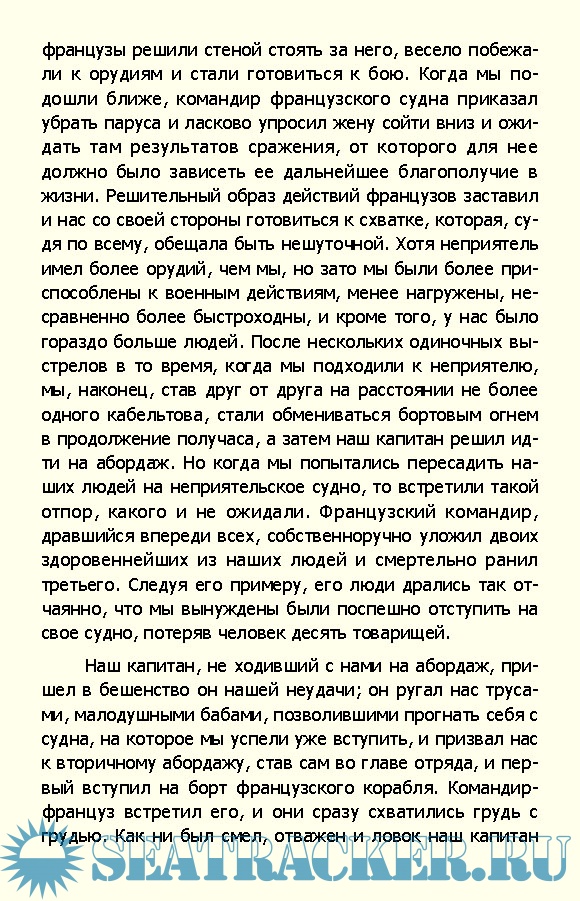 Год выпуска: 2008 Язык: Русский Автор: Фредерик Марриет Издательство: Вече Издание: Морской авантюрный роман Формат: FB2 Качество: Изначально компьютерное (eBook) Количество страниц: 423 Описание: Молодой человек по имени Александр Месгрев, изгнанный в 17 лет из родительского дома, поступает служить на Приватир - судно, которому в военное время разрешалось нападать на торговые суда противника. Юному Александру предстоит полная необыкновенных приключений жизнь: он участвует в захвате неприятельских кораблей, сам попадает в руки пиратов, оказывается пленником дикарей в Африке и чудом спасается.