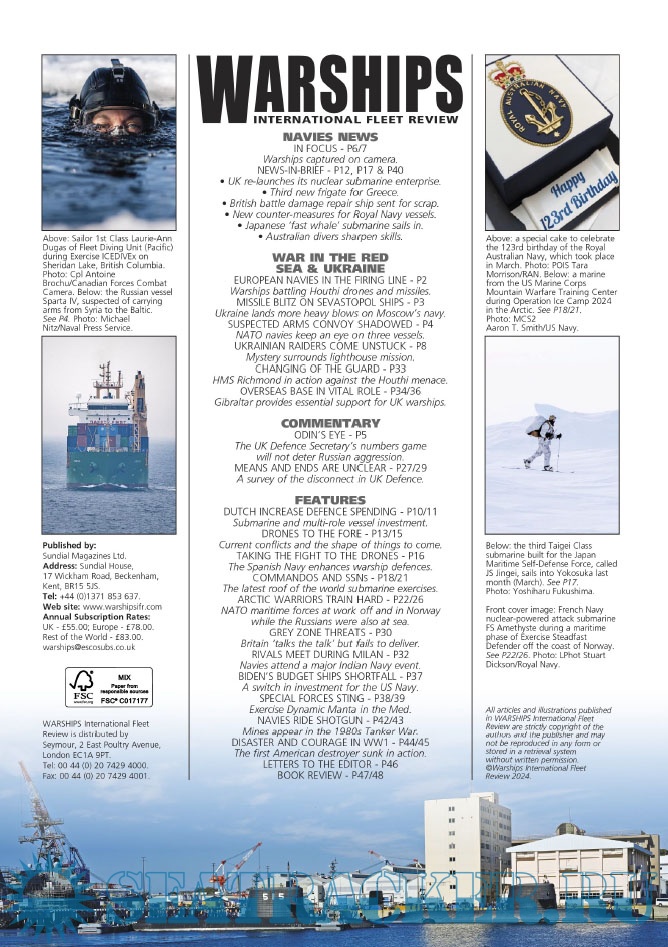 Description: Warships IFR puts the spotlight on the latest developments in the world’s navies. It covers current defence issues and has comments by leading analysts. The magazine regularly includes features on the Royal Navy and the US Navy in addition to incorporating news and features on all other navies across the globe. Warships IFR frequently carries in-depth articles on naval heritage.WARSHIPS International Fleet Review is published 12 times a year by Tandy Media Ltd who also publish Shipping Today & Yesterday (which provides news and features from the world of merchant shipping).