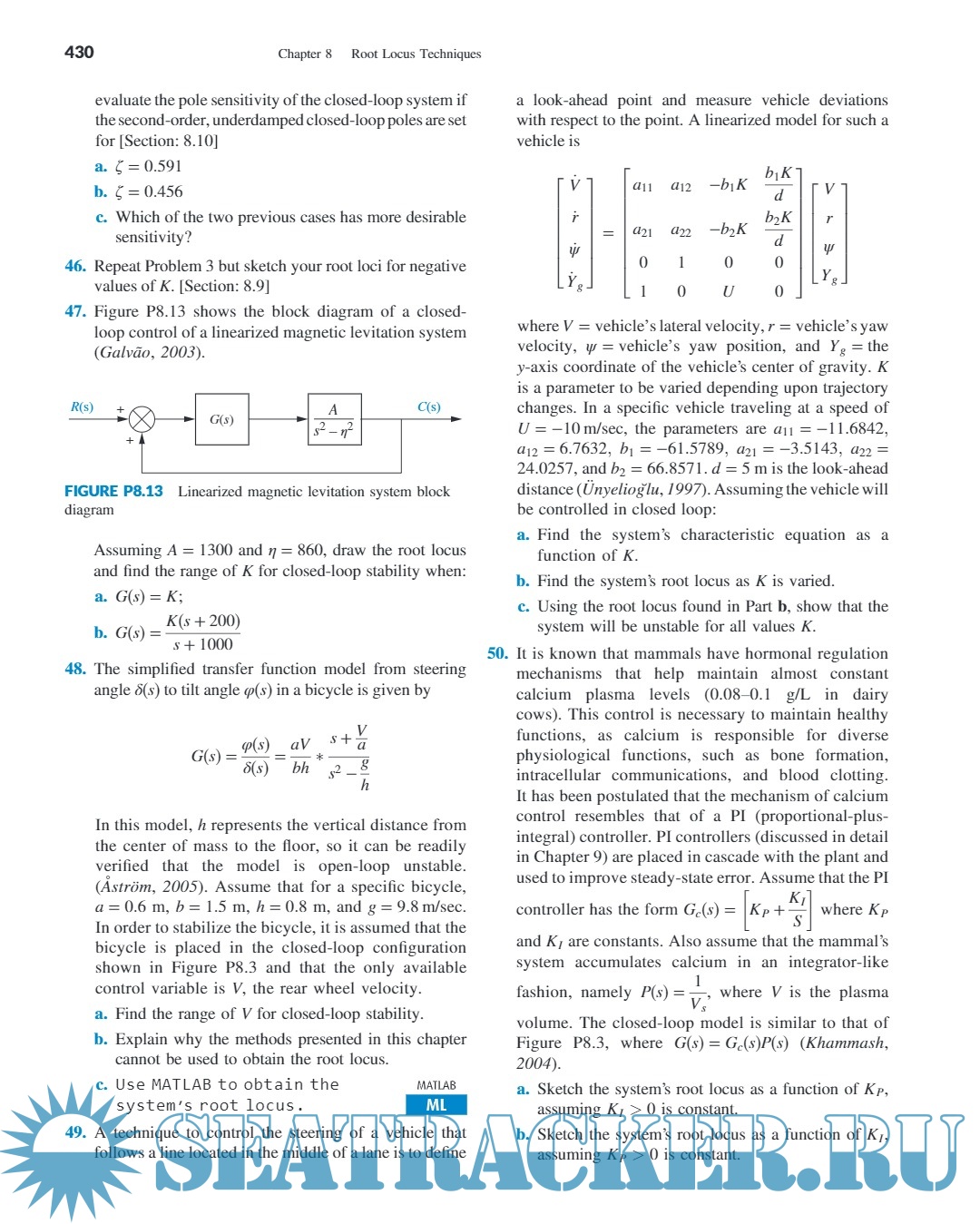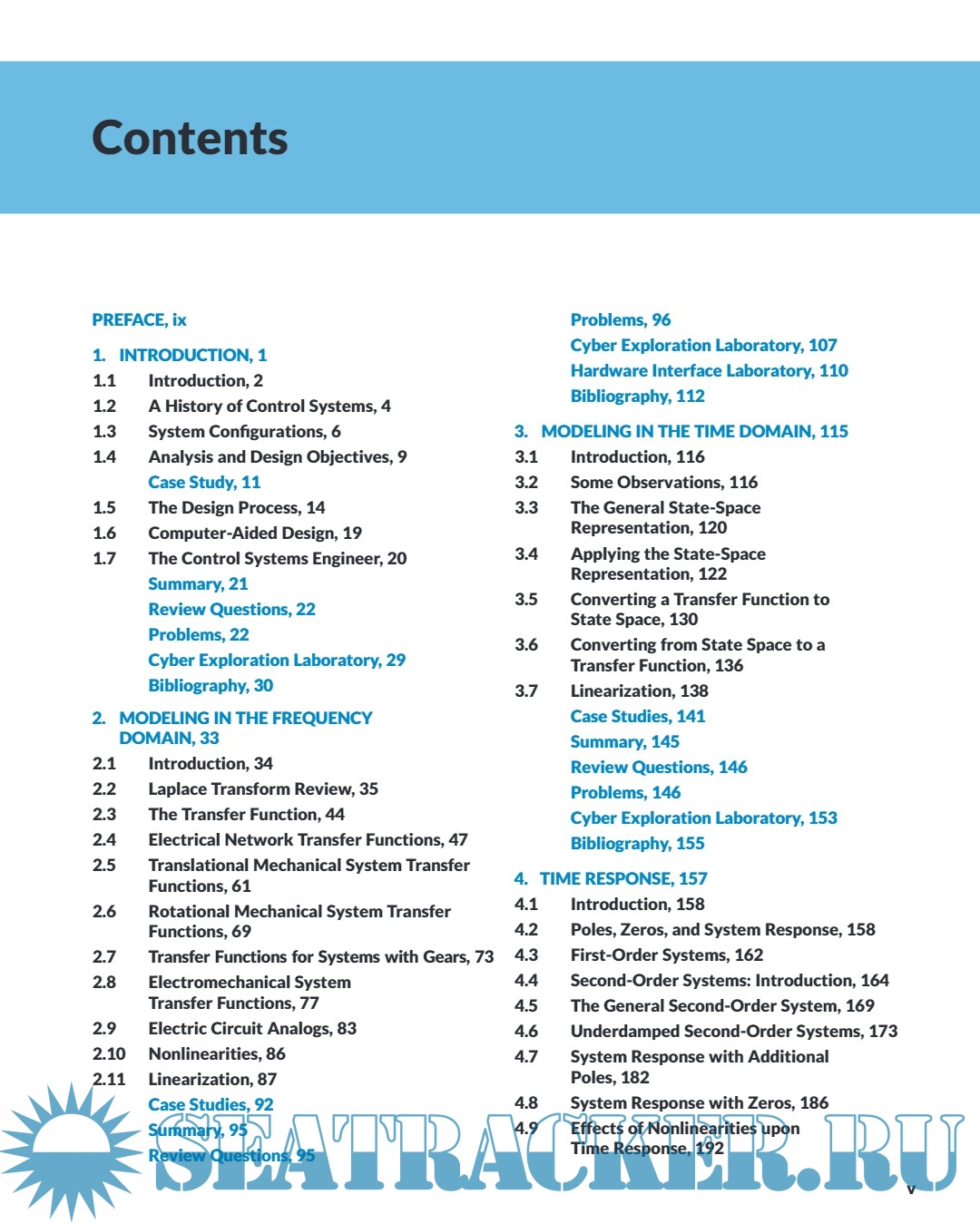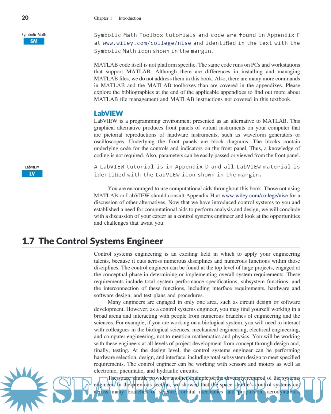 Year: 2015 Language: English Author: Norman S. Nise Genre: Reference book ISBN: 978-1-118-17051-9, 978-1-118-80082-9 Format: PDF Quality: eBook Pages count: 943 Description: This book introduces students to the theory and practice of control systems engineering. The text emphasizes the practical application of the subject to the analysis and design of feedback systems. The study of control systems engineering is essential for students pursuing degrees in electrical, mechanical, aerospace, biomedical, or chemical engineering. Control systems are found in a broad range of applications within these disciplines, from aircraft and spacecraft to robots and process control systems. Control Systems Engineering is suitable for upper-division college and university engineering students and for those who wish to master the subject matter through self-study. The student using this text should have completed typical lower-division courses in physics and mathematics through differential equations. Other required background material, including Laplace transforms and linear algebra, is incorporated in the text, either within chapter discussions or separately in the appendixes or on the book's Companion Web site. This review material can be omitted without loss of continuity if the student does not require it.