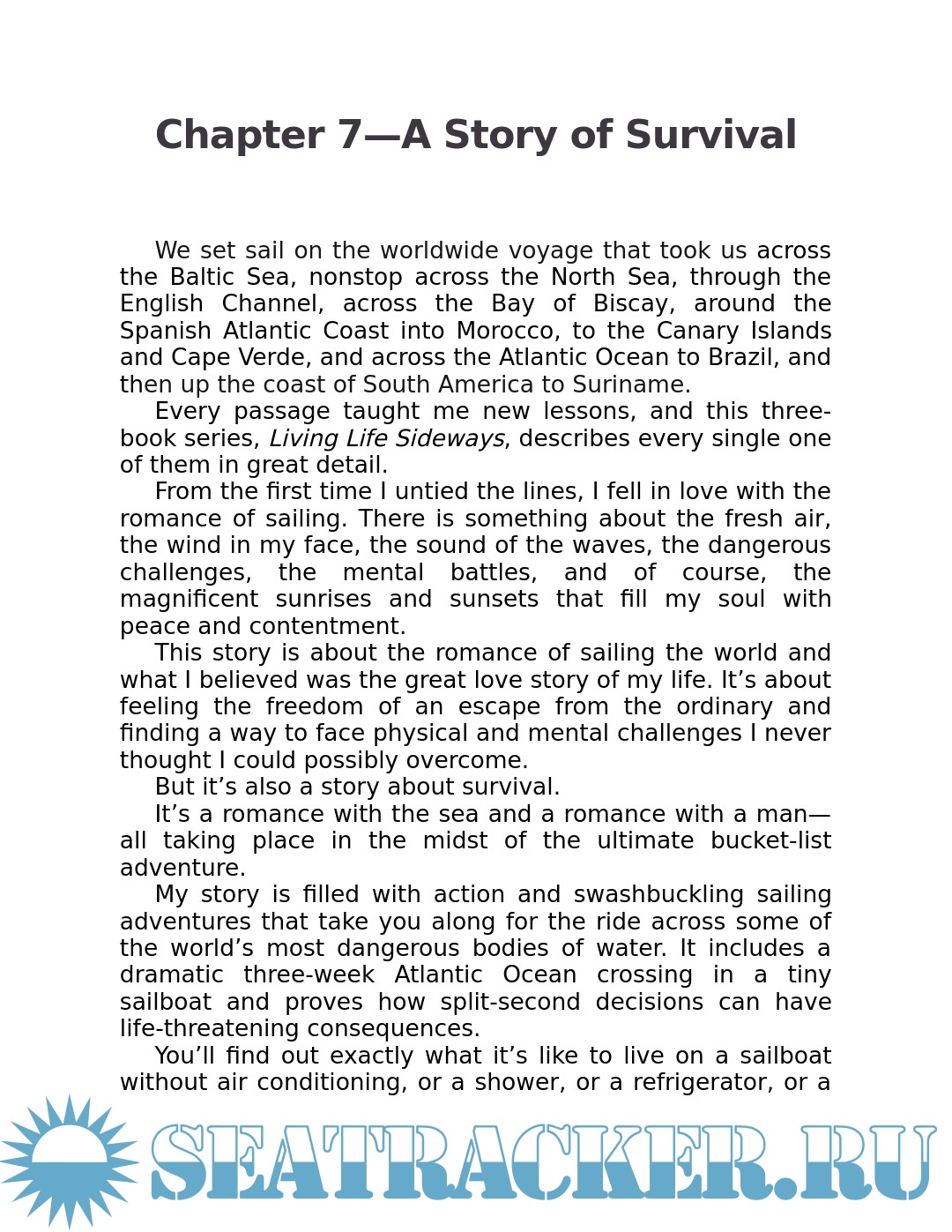 Living Life Sideways paints a vivid picture of the adventure of a lifetime (a year-long, worldwide sailing journey), coupled with the fight of a lifetime. It describes one sailor's odyssey to regain her sense of self when she realizes that her peace of mind is worth more than she could have ever imagined.