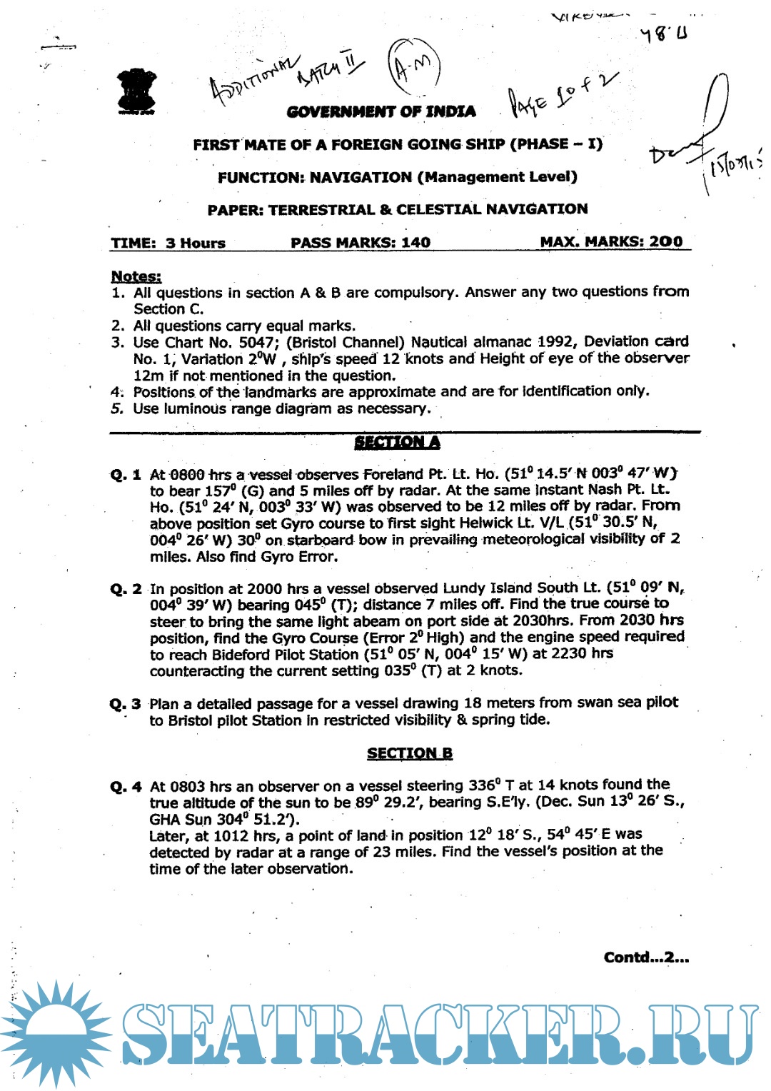 Description: Question Paper Set for Phase I (Chief Mate F.G.) Mercantile Marine Department (MMD), India Examination