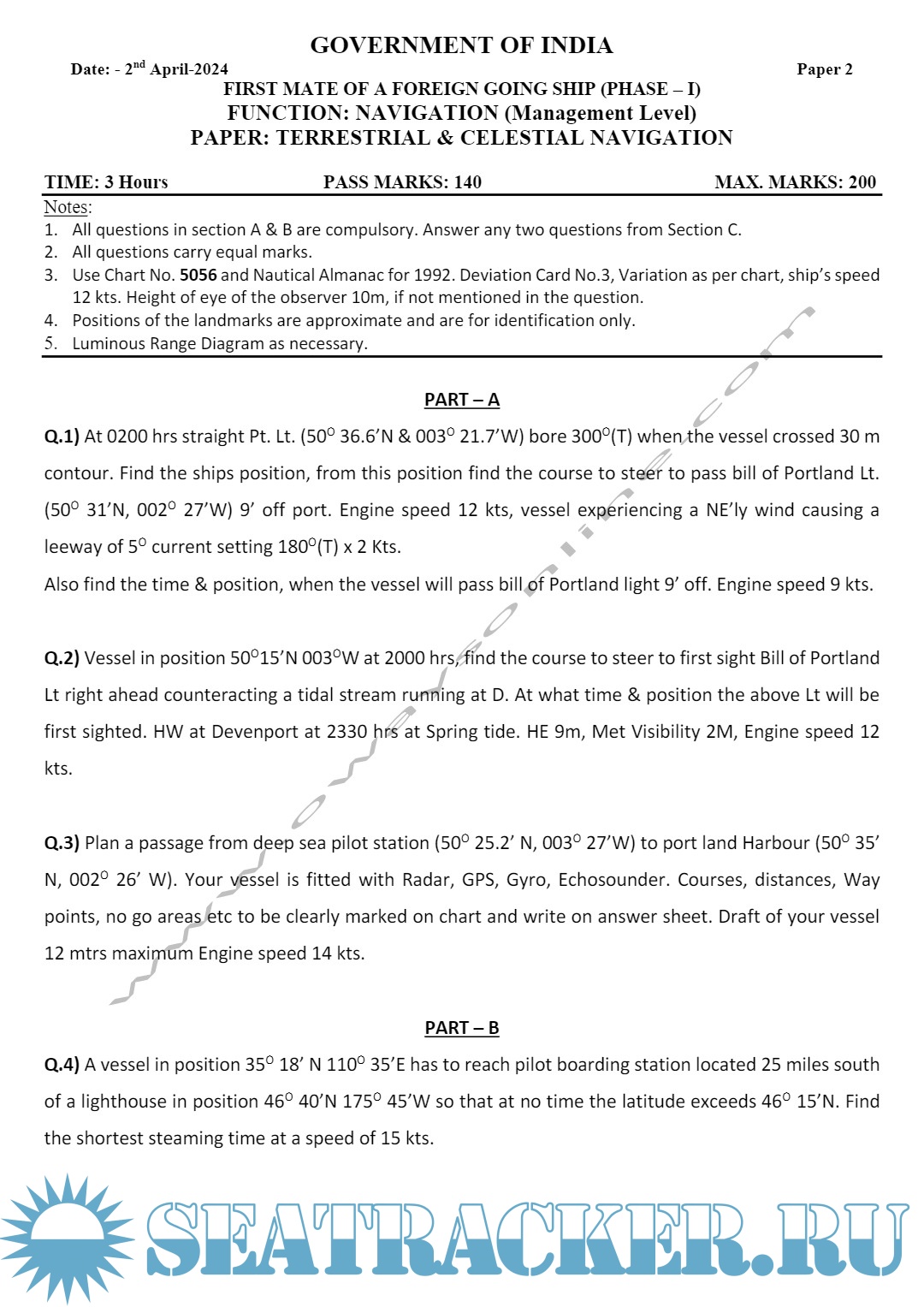 Question Paper Set (April 2024) for Phase I (Chief Mate F.G.) Mercantile Marine Department (MMD), India Examinations