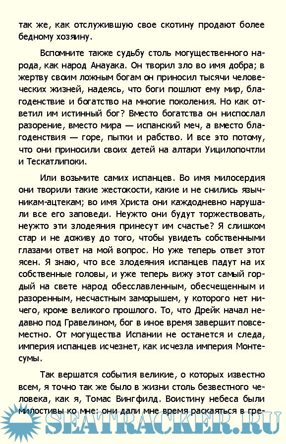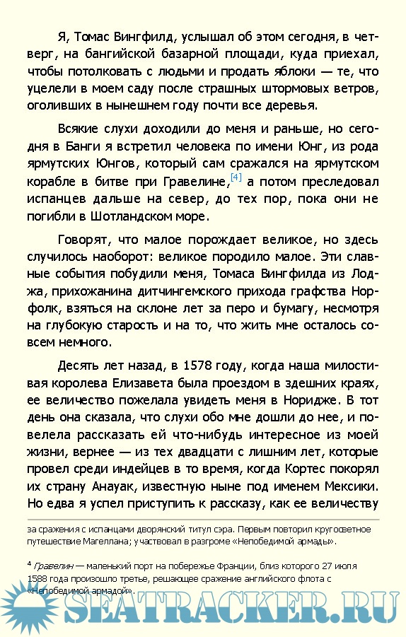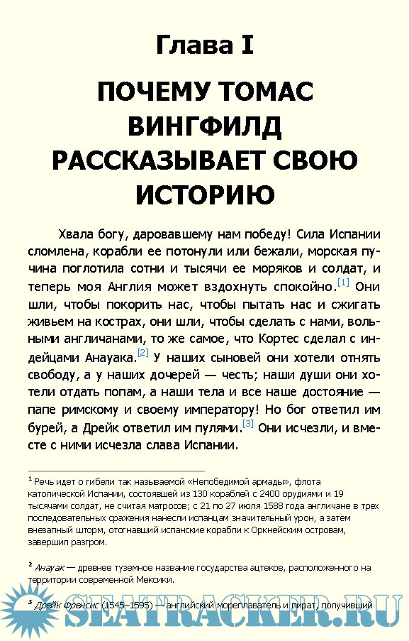 Описание: В основу одного из лучших приключенческих романов известного английского писателя легли исторические события эпохи великих морских географических открытий и завоеваний. Герой произведения Томас Вингфилд, от имени которого ведется повествование, пишет свои `воспоминания` сразу же после разгрома `Непобедимой армады` - флота католической Испании. Рассказывая историю своей необычайной жизни, Томас Вингвилд переносится во времена своей юности, наполненной страстями, битвами и невероятными приключениями
