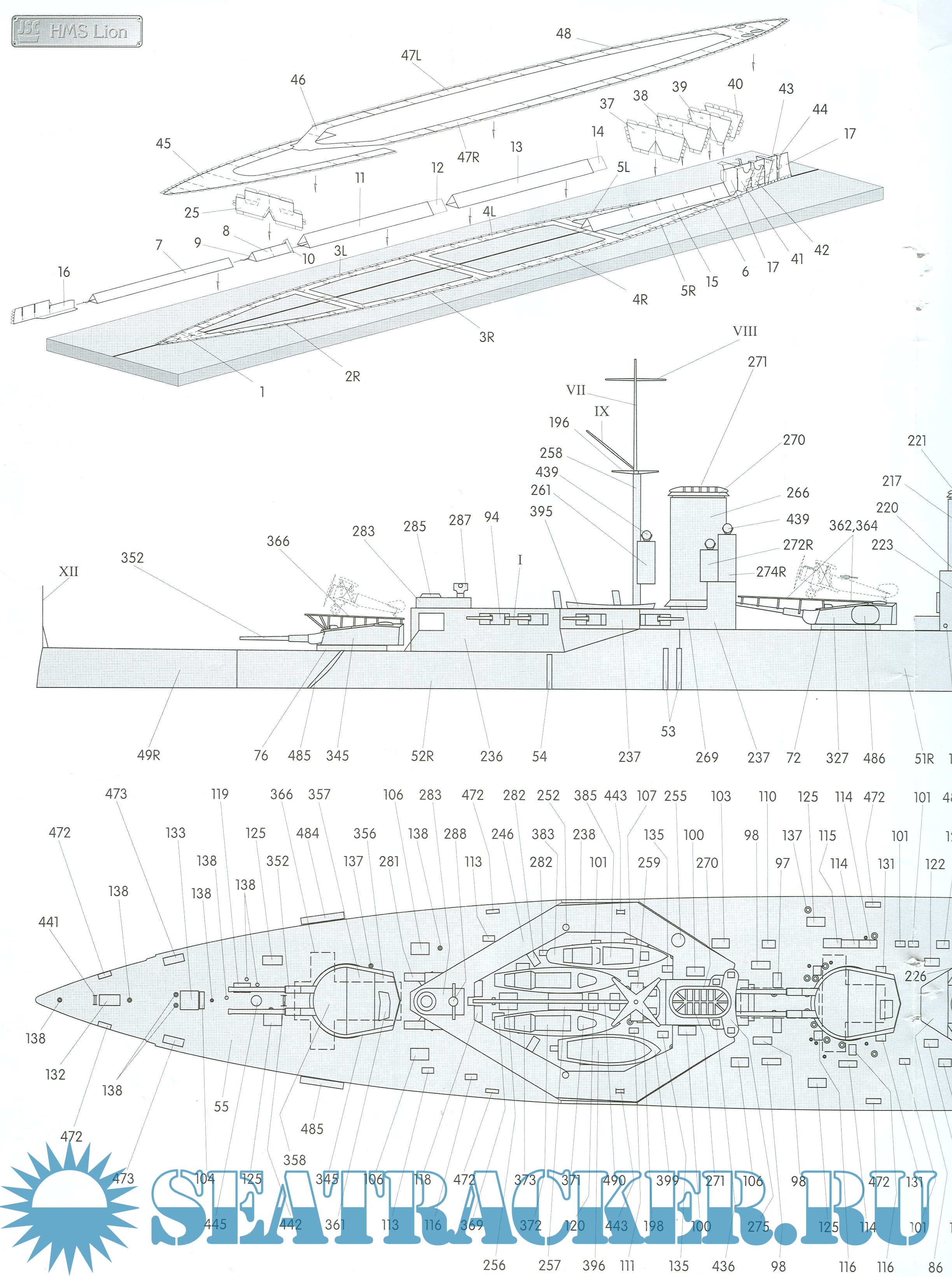 33 листа цветных выкроек и инструкций для изготовления бумажной модели линейного крейсера HMS "LION" (Великобритания) по состоянию на 1918 год в масштабе 1:250