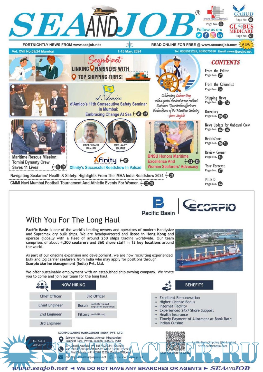 Description: The Sea and Job magazine launched in May 2007, was the second venture of Sea Line Group succeeding 'seajob.net' bringing the much renowned essence to the Group, the Sea and Job Magazine quickly gained popularity, becoming the No. 1 Shipping Magazine that came to be widely circulated all over India. Sea and Job over the years has evolved as the most trusted, ethical, objective and read maritime publication that possesses a large database of subscribers from various verticals in the industry.The magazine provides informative and interesting articles covering not just the shipping world but also the world outside it.Sea and Job is also a medium for the shipping/ manning companies to advertise marine jobs and also to promote their organization by publicizing internal activities like seminars, sports events and parties.Some notable endeavors of the magazine include the Know Your Recruiter Column, the Sailing Episodes Column and the Marine Insights section. The consistent efforts and the dedication to provide extraordinary services to the industry has resulted in the magnifying popularity and patronage of Sea and Job.