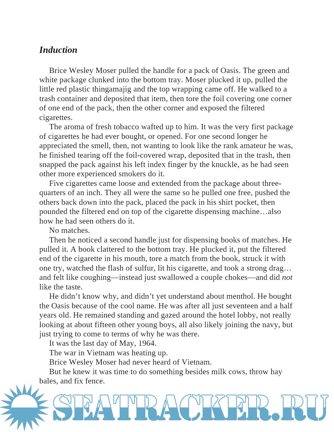 This novel follows Brice Wesley Moser, a seventeen-year-old farm boy from Iowa from his induction at Des Moines, through bootcamp and Class A Weapons School at San Diego, to his first short duty at a guided missile unit at Pearl Harbor, to volunteering for submarine duty and landing on the USS Hagfish, a boat specially-fitted for hauling troops and dispersing special ops UDT and SEAL team members while submerged.
