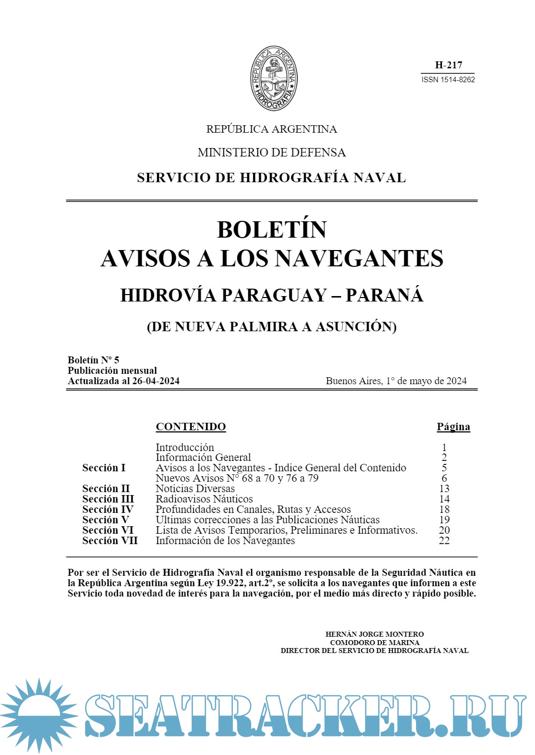 Description: El Servicio de Hidrografia Naval presta el servicio público de "Seguridad Náutica", entre otras actividades, editando desde 1998, la presente Publicación H-217 "Boletín Avisos a Los Navegantes Hidrovía Paraguay-Paraná".