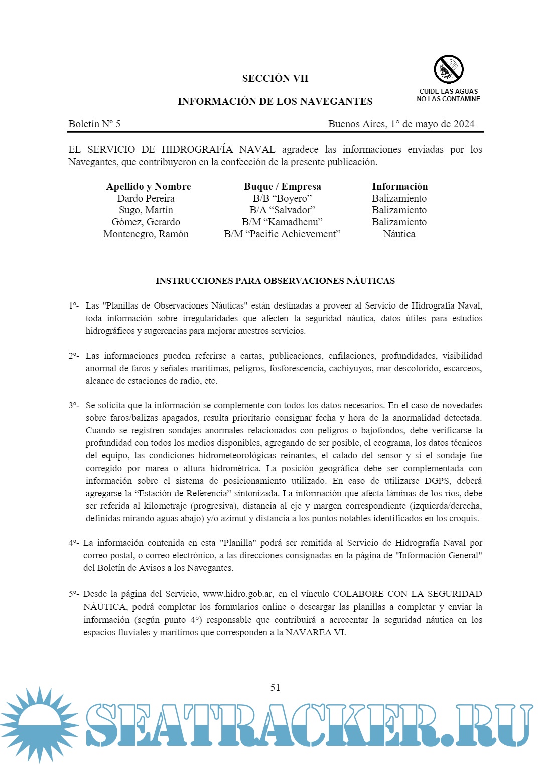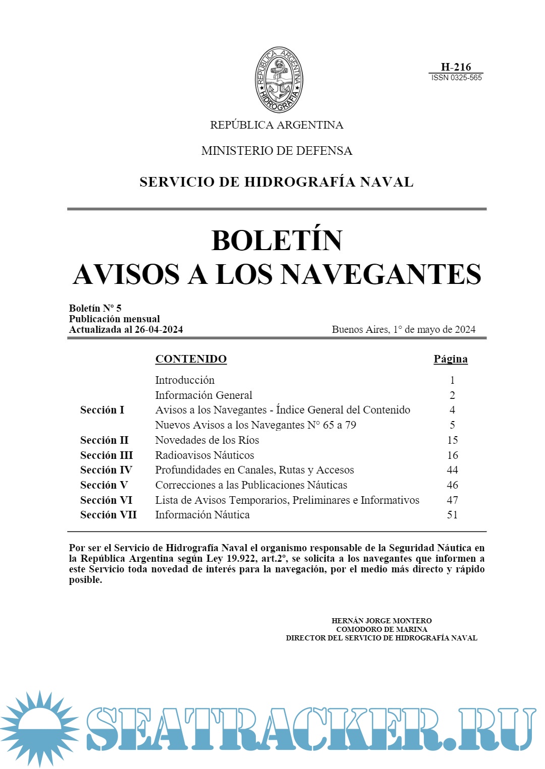 Year: 2024 Language: Spanish Author: Servicio de Hidrografía Naval Publisher: República Argentina Ministerio de Defensa Edition: Mayo 2024 Format: PDF Quality: eBook Pages count: 55 Description: El Servicio de Hidrografia Naval presta el servicio público de "Seguridad Náutica", entreotras actividades y edita desde 1918, la presente Publicación H-216 "Bletín Avisos a Los Navegantes".