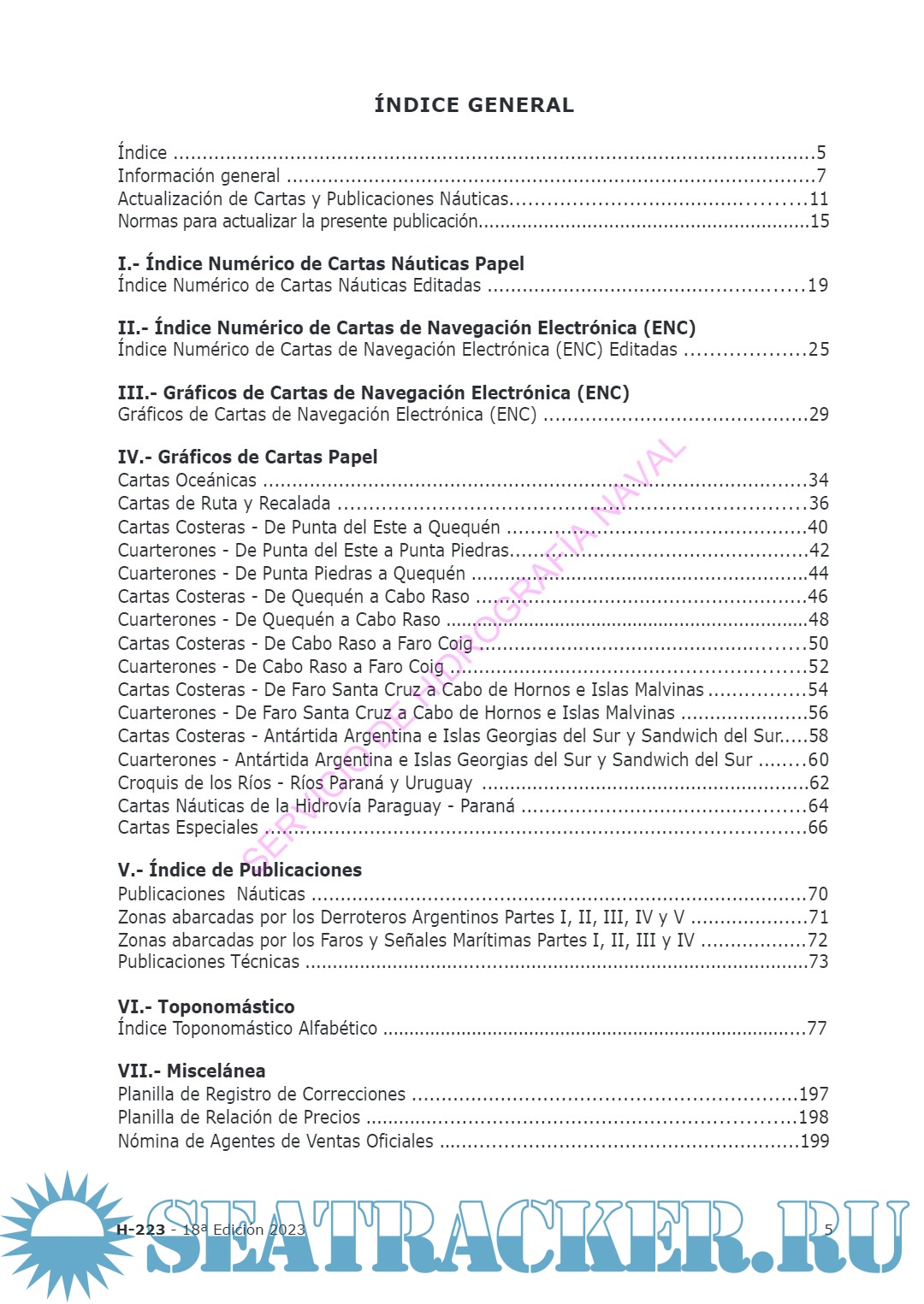 En la Parte V podrá encostrarse la relación ordenada de publicaciones náuticas y técnicas, con indicación de sus ediciones y precios de venta. Se incluyen también gráficos correspondientes a la zonas abarcadas por las distintas partes de las publicaciones Derroteros Argentinos, Faros y Señales Marítimas.