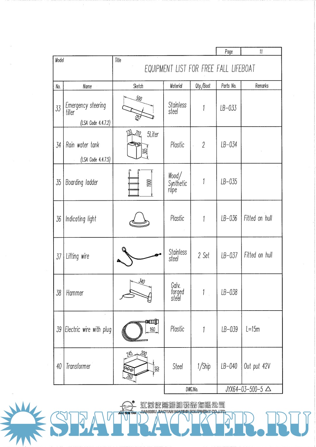 Year: 2012 Language: English Author: Collective Genre: Documentation Format: PDF Quality: eBook Pages count: 130 Description:This boat are designed, condtructed and equipped in accordance with "1983, 1996, 2000 and 2006 amendents to the international convention for safaty of life at sea, 1974", Lsa code "new Msc resolution 218(82), 226(82) and 272(85) to amend Msc.81(70)", "guidance for the approval and type approval of materials and equipment for marine use 1998" and also Med. Boat type: Normal type free-fall life boat, model Jym-fn-6.65. Specification. General arrangement of free-fall life boat Jym-fn-6.65 (Normal type). Equipment list for free-fall life boat. General arrangement of engine. Spare parts for diesel engine. Detail of realise hook. Arrangement of steering system. Arrangement of battery charging system. Spare parts for electric parts. Recommended lubrication oil, fuel and cooling water. Freefall lifeboat operation & Maintenance manual. Yanmar diesel engine operation manual. Electric diagram. Maintenance.