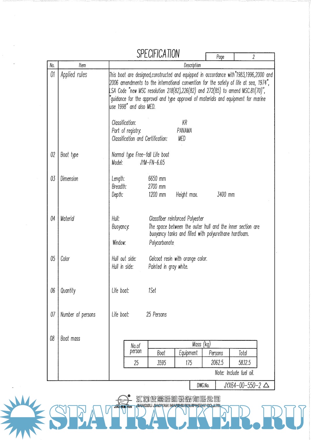 Boat type: Normal type free-fall life boat, model Jym-fn-6.65.