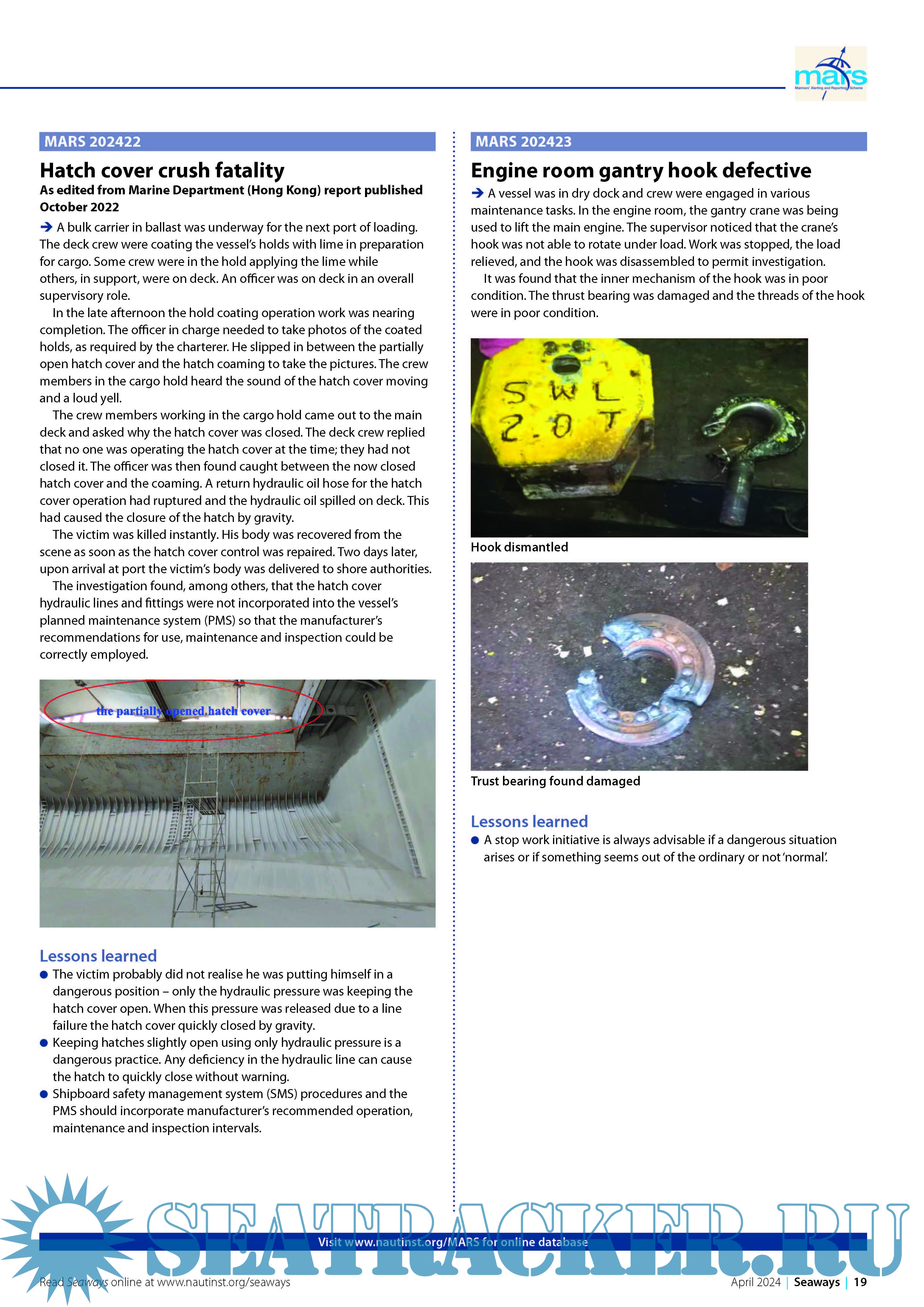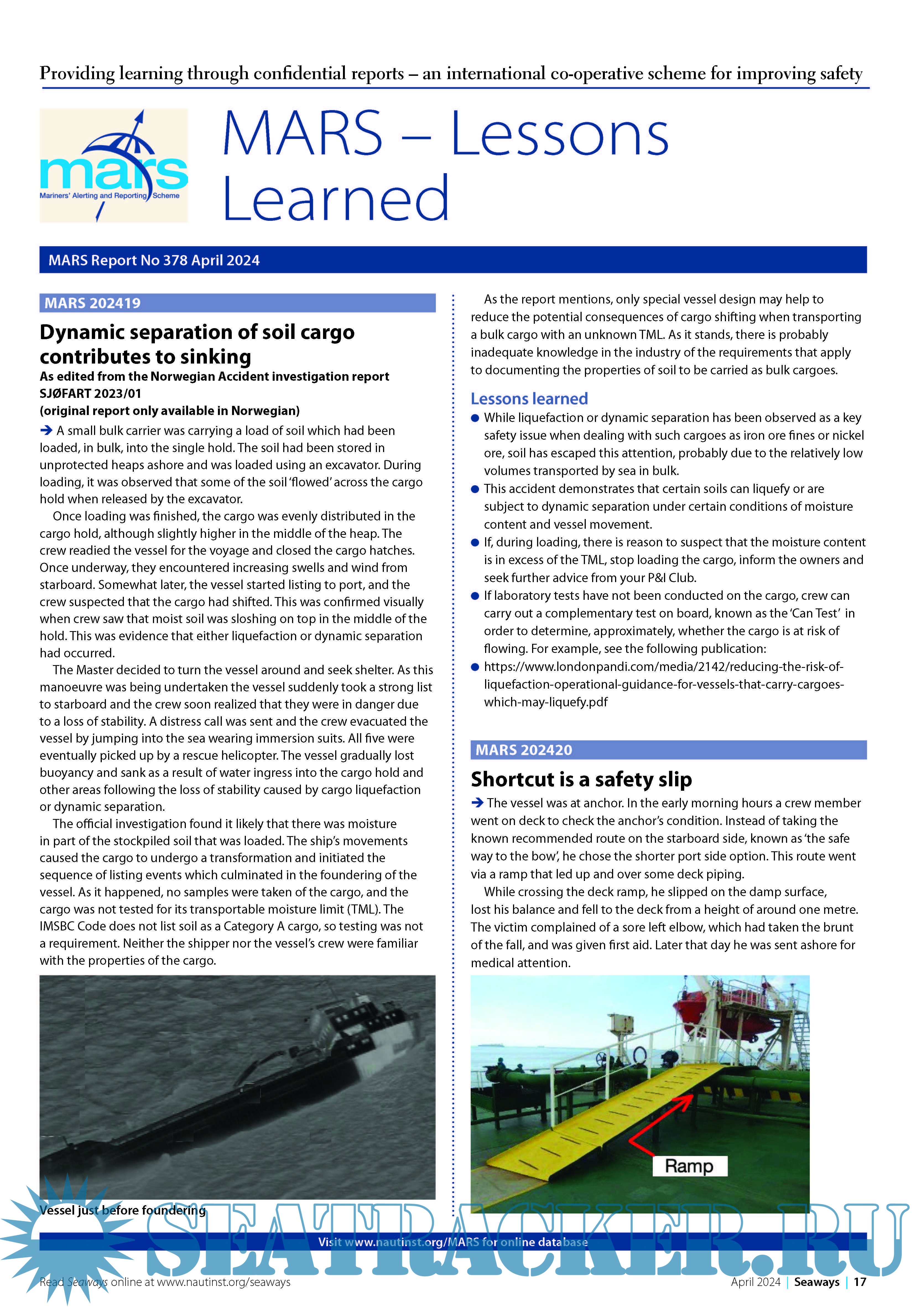 Year: 2024 Language: English Author: The Nautical Institute Genre: Periodical (magazine) Format: PDF Quality: eBook Pages count: 4 Description: MARS Report No 378 April 2024 Providing learning through confidential reports – an international co-operative scheme for improving safety.MARS is a searchable database containing reports of accidents and near misses stretching back over a quarter of a century. Funded through the generous support of the Institute's Nautical Affiliate partners, it is one of the maritime industry's leading risk reduction initiatives and is helping to make life safer for seafarers everywher.
