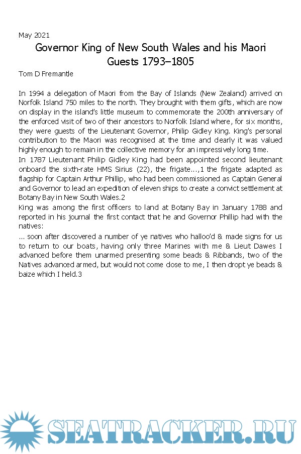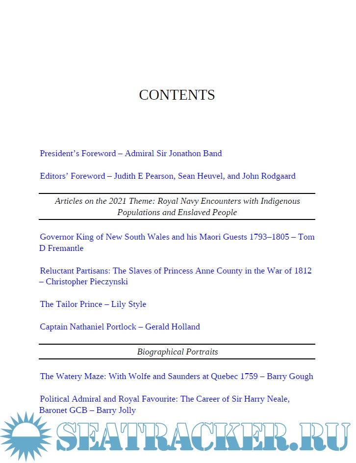The theme of the 2021 issue is ‘Georgian Navy encounters with indigenous and enslaved populations’. The theme is particularly relevant to current-day discussions and social activism occurring across the globe, that have brought new insights and perspectives to Western history of colonization, exploration, and slavery. The lead article, by 1805 Club member Tom D Fremantle, tells the story of his ancestor, Philip Gidley King, who sailed to Botany Bay with the First Fleet in 1787. becoming the first Lieutenant Governor of Norfolk Island. and the third Governor of New South Wales. His encounters with the Maoris are unforgettably touching. Another contribution reveals how the British lured slaves away from their American masters’ plantations with the promise of freedom during the War of 1812.